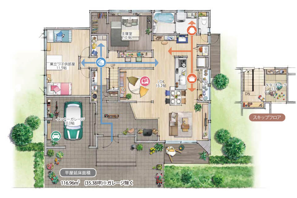 大容量のスキップ収納を作り上げ、収納性にも非常に優れた平屋プランをご提案いたします。