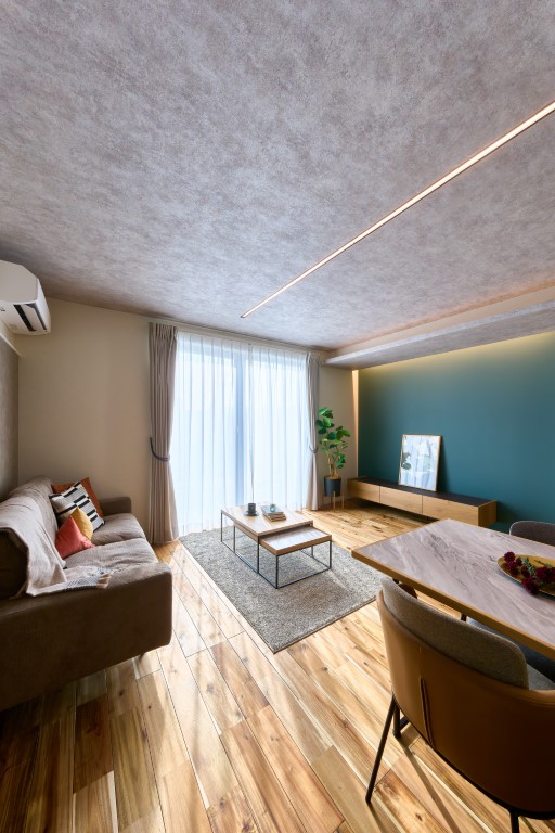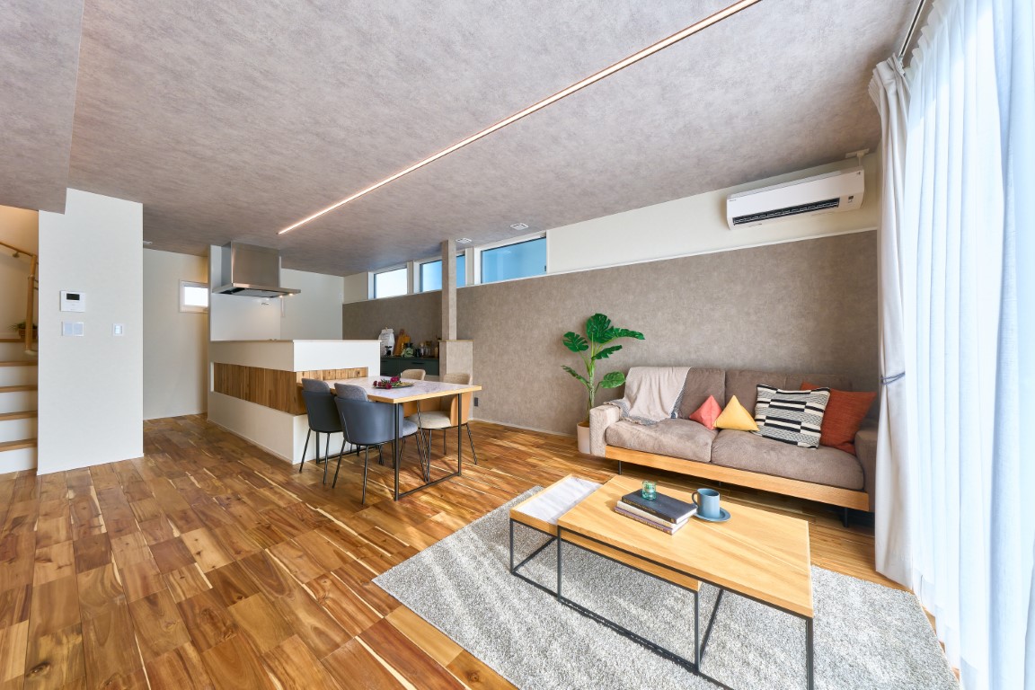 天井や壁面に間接照明を取り入れることで、空間にやわらかな光の広がりを演出。まぶしさを抑えながら、昼と夜で表情が変わる、落ち着きと上質感のある住まいを実現しています。