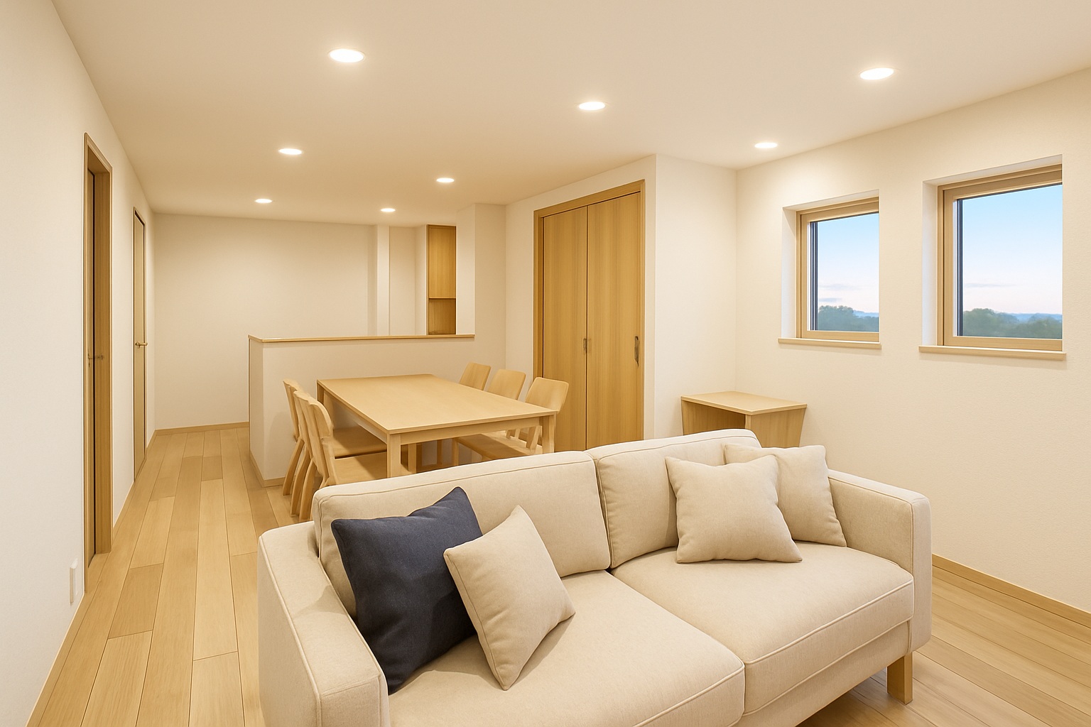リビングを2階に配置することで、たっぷりの光と眺望を確保。外からの視線も届きにくく、プライバシーを守りながらのびのびと過ごせます。カーテンを閉めきらなくても心地よい、安心感のある空間。家族だけの時間を、明るく開放的に楽しめる住まいです。