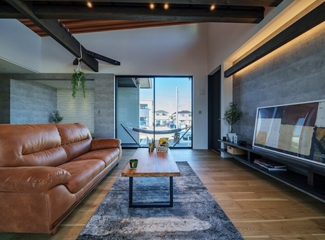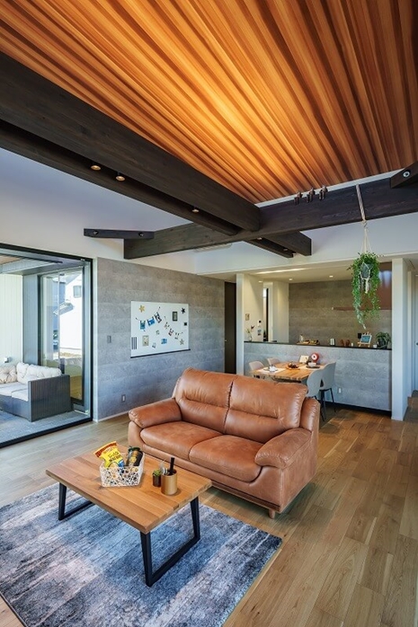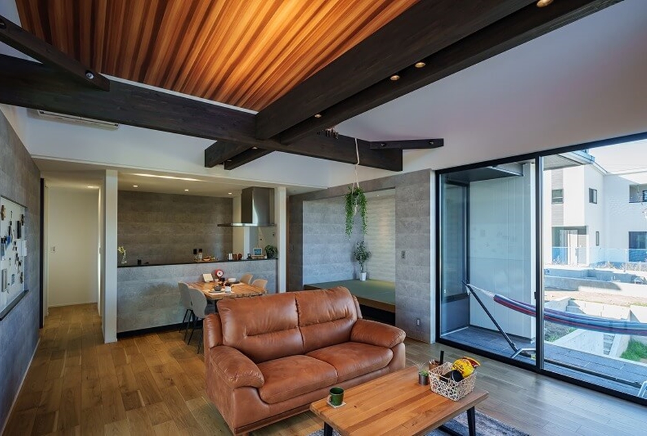屋根の形に沿って天井を高くした勾配天井。空間が縦に広がり、開放感があるので家族が自然と集まる空間になります。