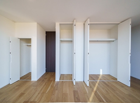 家族みんなで使えるクローゼットをランドリールームの横に配置。洗濯物を各部屋に持っていく必要がないので洗濯時間がグッと短くなります。