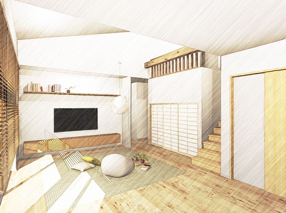 1層は収納、2層はタタミコーナー、3層は扉付き小屋裏収納を2つ用意し、秘密基地のような空間に仕上げました。吹き抜け部分にはロールスクリーンを付け、開放感と独立を両立できるようにしました。