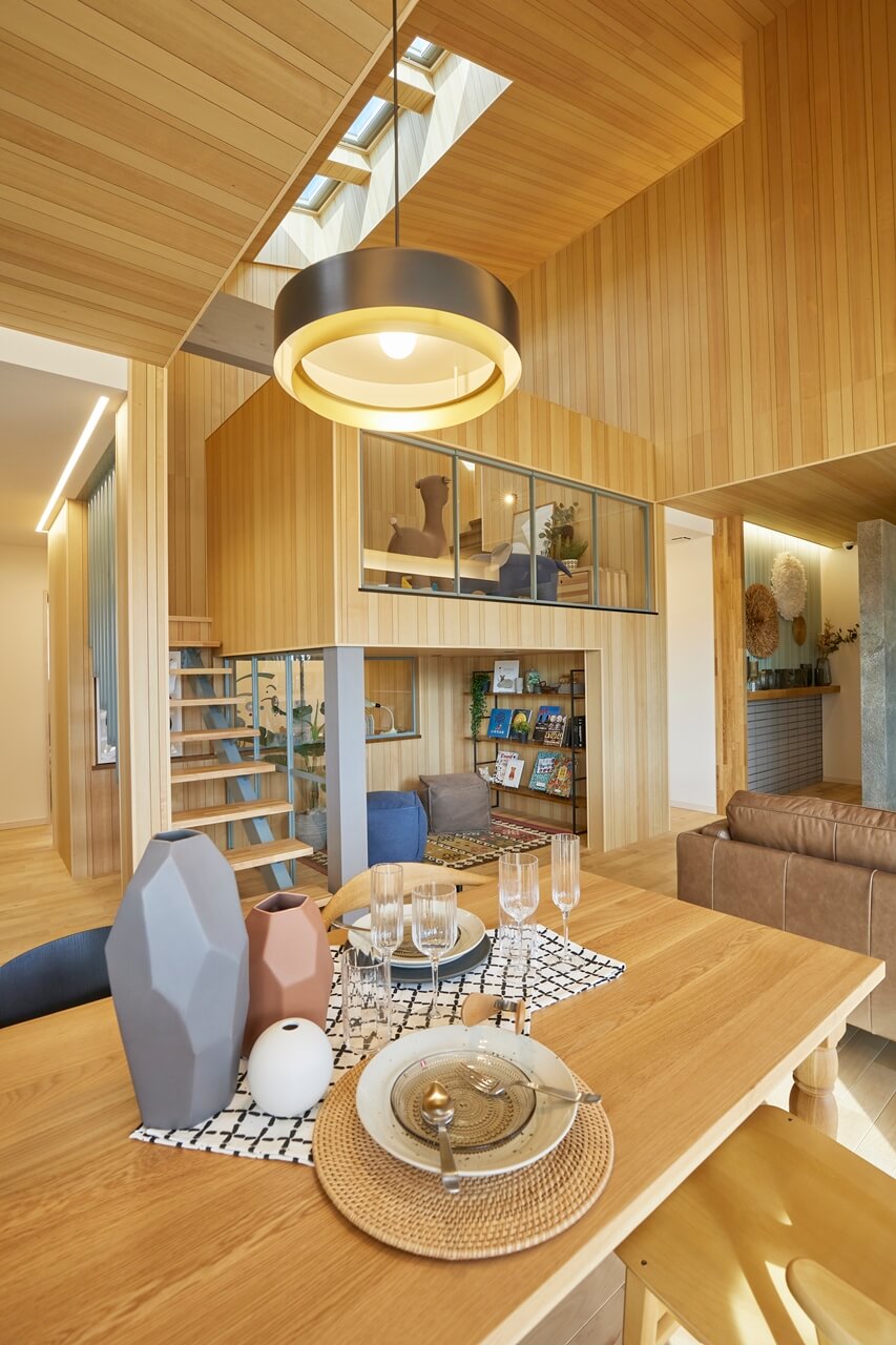 屋根勾配を活かした立体的な空間演出や、収納・家事に最適な間取りが叶える「平屋+α」の展示場です。