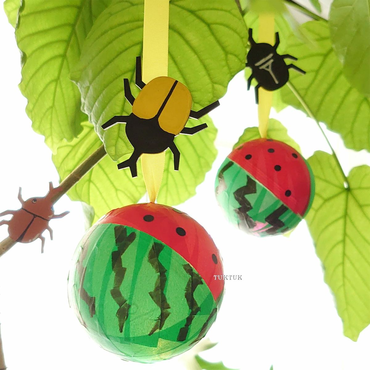カラフルに色が次々と変わるあっつーい夏にぴったりのすいかライト。夏らしさを追加するカブトムシのバッジ付き!