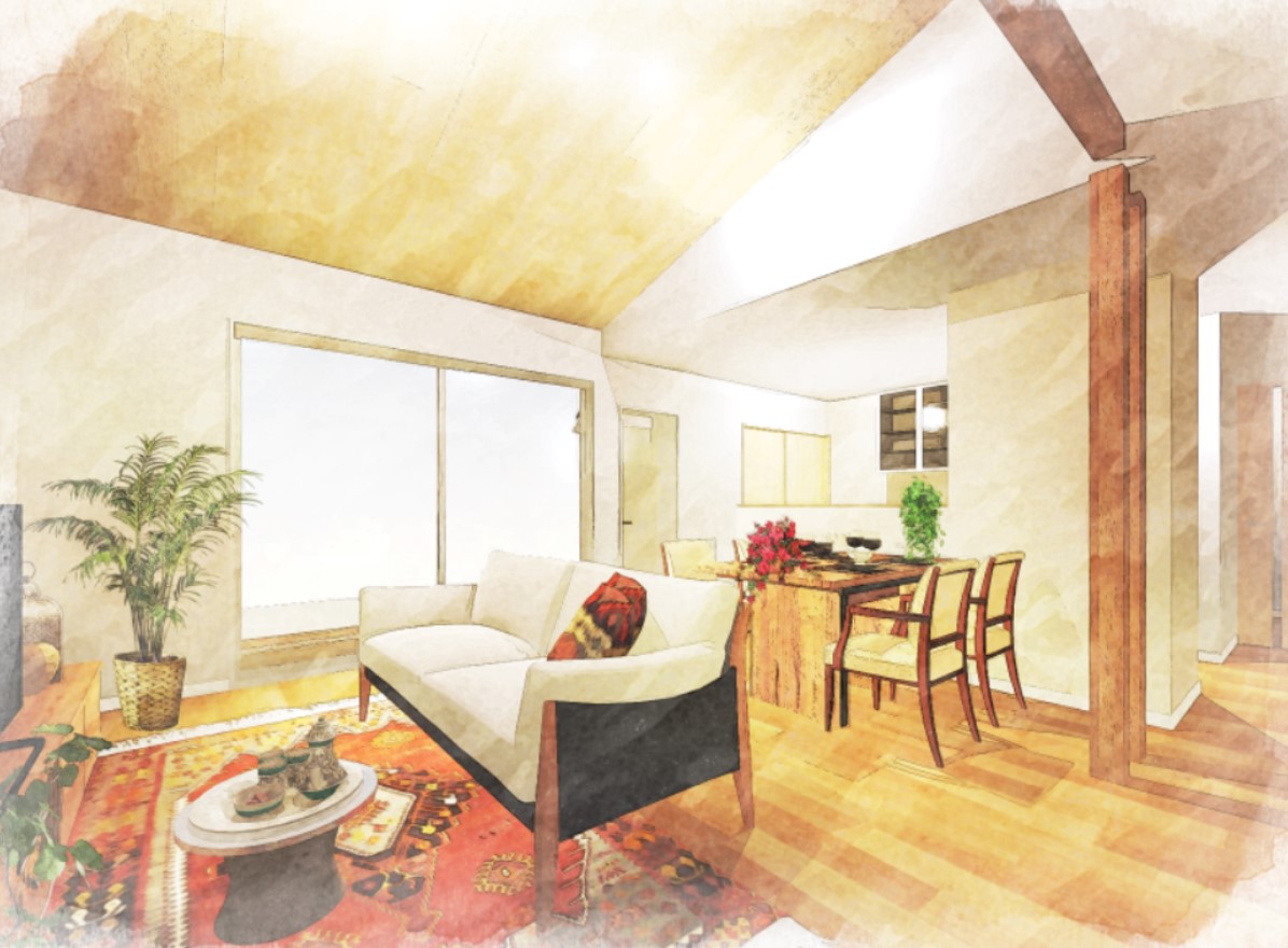 屋根の形に沿って天井を上げた勾配天井仕様のLDK。空間に開放感が生まれ、広々と快適に暮らすことができます。