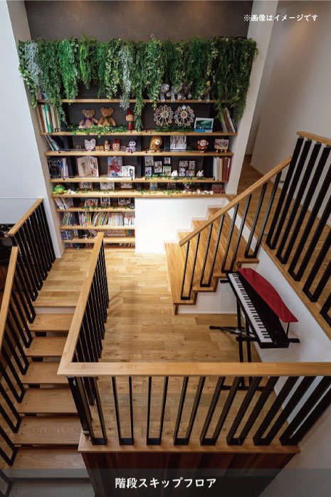 階段の踊り場を利用したスキップフロア。上部は家族用スペース、下部は収納として使用が可能です。