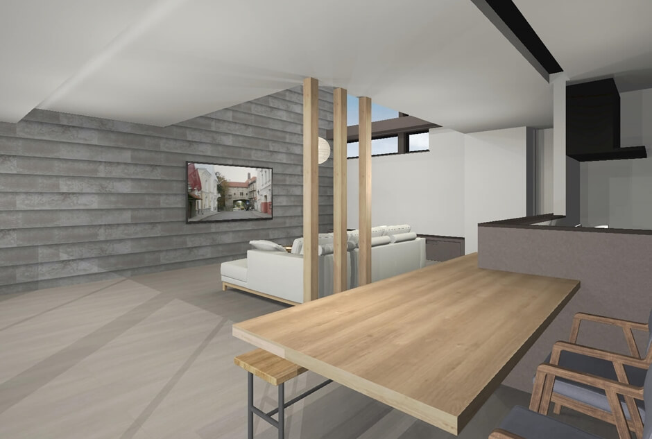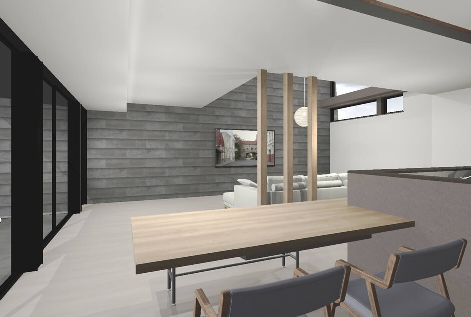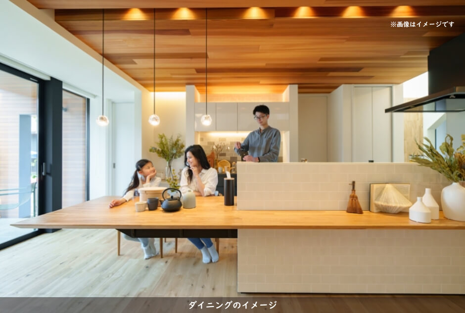 屋根の形に沿って天井を高くした勾配天井。空間が縦に広がり、開放感があるので家族が自然と集まる空間になります。吊るした照明も印象的です。