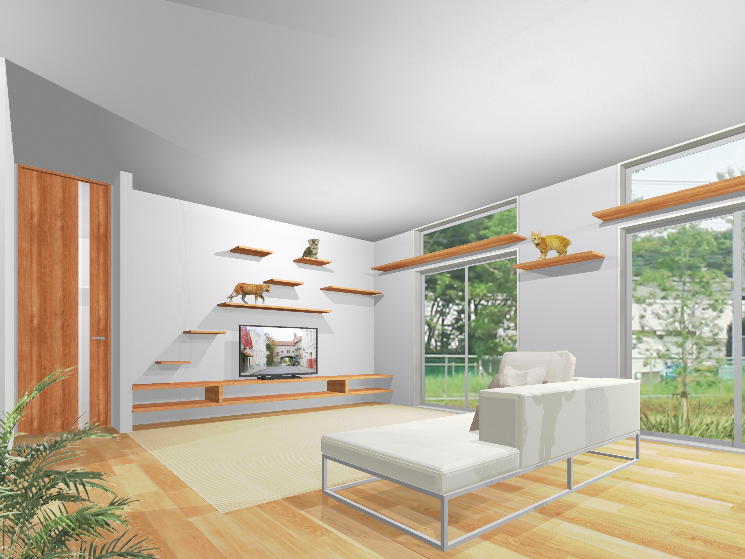 猫ちゃん大喜びのキャットウォークをリビングに作り、人も猫も快適に楽しく暮らせる家を実現しました。テレビを観ながら猫ちゃんを眺める…そんな幸せ体験が可能です。