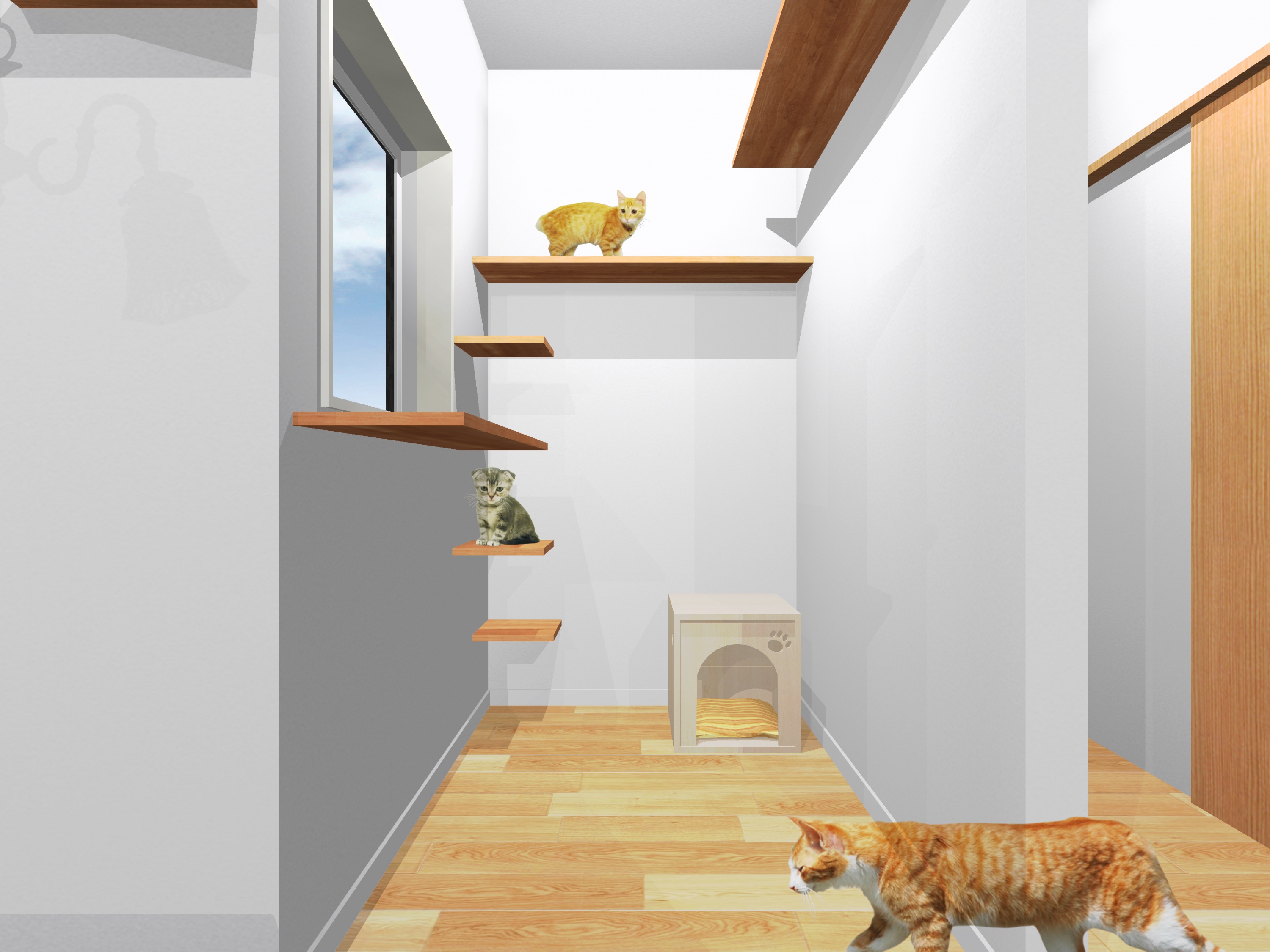 猫ちゃんのハウスやトイレを置く、猫ちゃん専用の空間を用意。半個室のような造りで、キャットウォークも付けました。