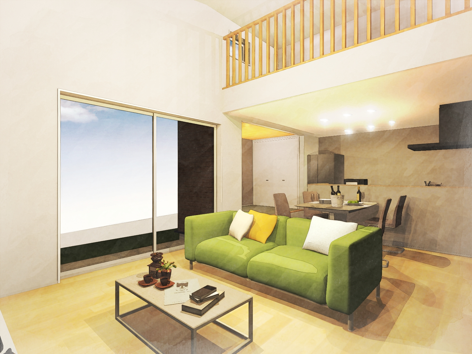リビングは勾配天井とスキップフロアを合わせた開放感のある造り。自然と空間が区切られ、たくさん家族が集まる居心地の良い空間となります。