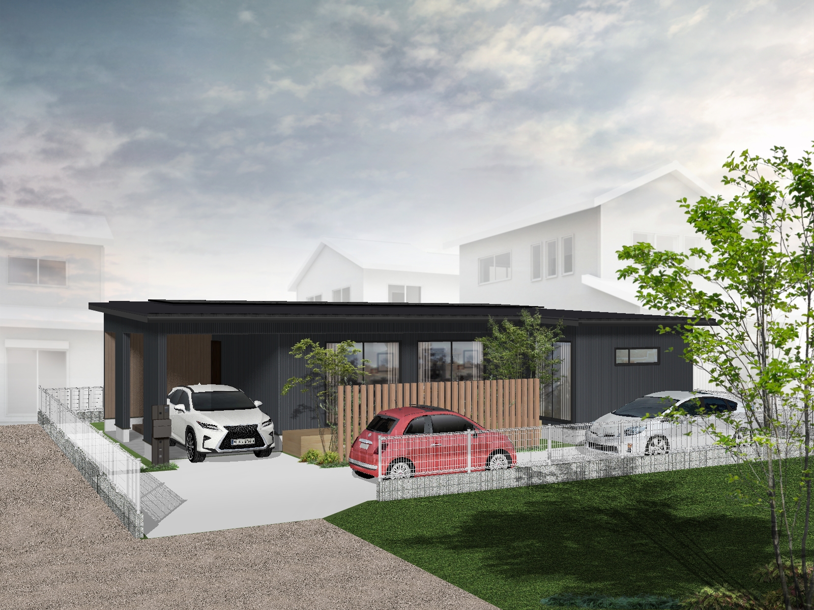 半屋外のガレージのある平屋。車の出し入れがラクで雨や日除けになり、カーポートなどの外構費用が抑えられます。
