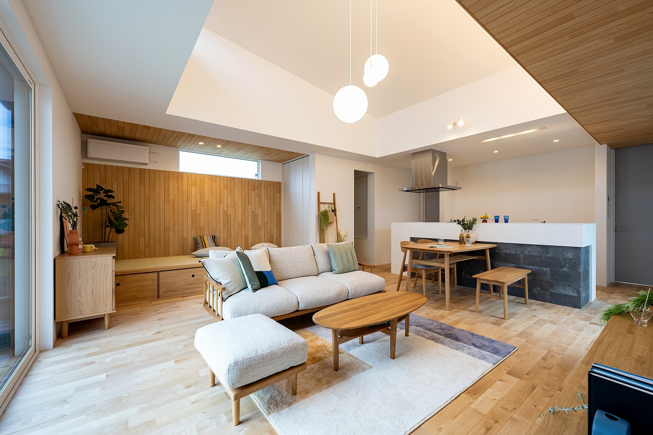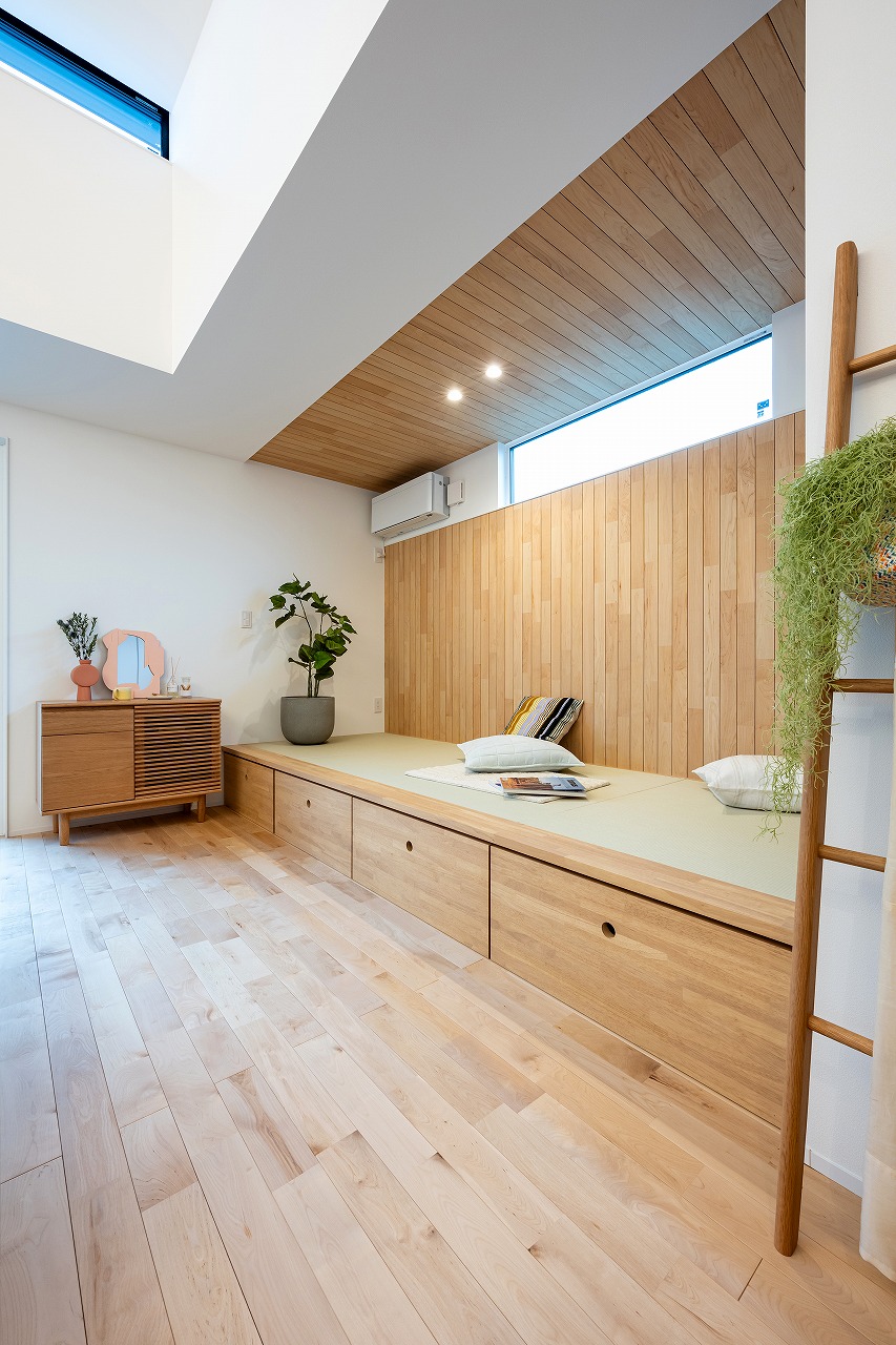 リビングと比べて30cmほど高く上がっているので少し腰を掛けたり、おむつ替えスペースとして使用するのにぴったり。LDK繋がりで家族の憩いの場になります。さらにこのタタミの下は収納にもなっています。