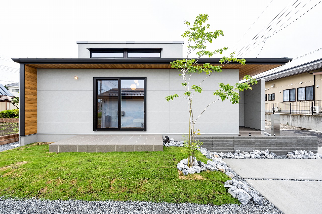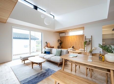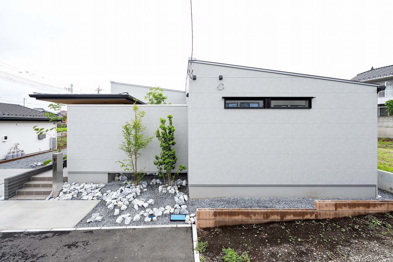 お部屋やお風呂、トイレ、寝室など生活に必要な動線がすべてワンフロアに揃っているので、小さなお子様やご年配の方と暮らすのにも安心な平屋です。また、屋根の形に沿って天井を高くした勾配天井で空間が縦に広がり、開放感を感じることができます。
