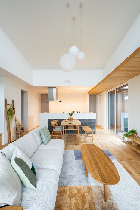 過ごし方に合わせて変化可能なソファや、お子さまが安心して遊べる大きなラグや角の丸いテーブル、明るく優しい素材感の棚にも注目です。