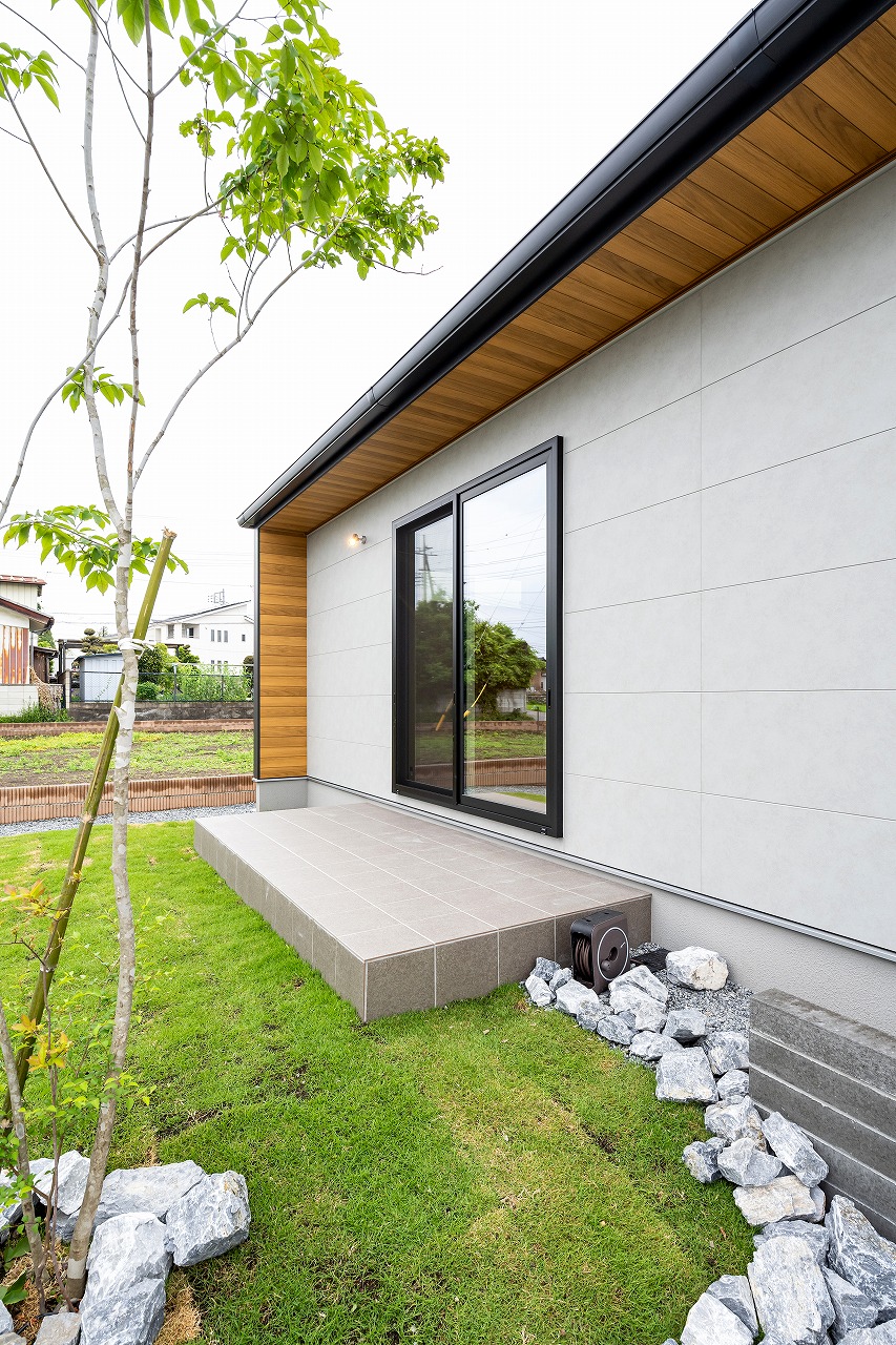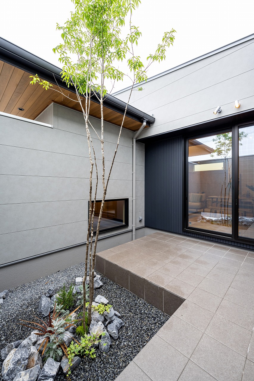 LDK、ホール、玄関と3か所から見える中庭。コの字型でプライベートも重視されるので、休日はBBQやプール、読書や晩酌をしてリゾート感たっぷりの暮らしが可能です。また、タイルデッキは丈夫で長持ちするのでお手入れもラクなのが嬉しいです。