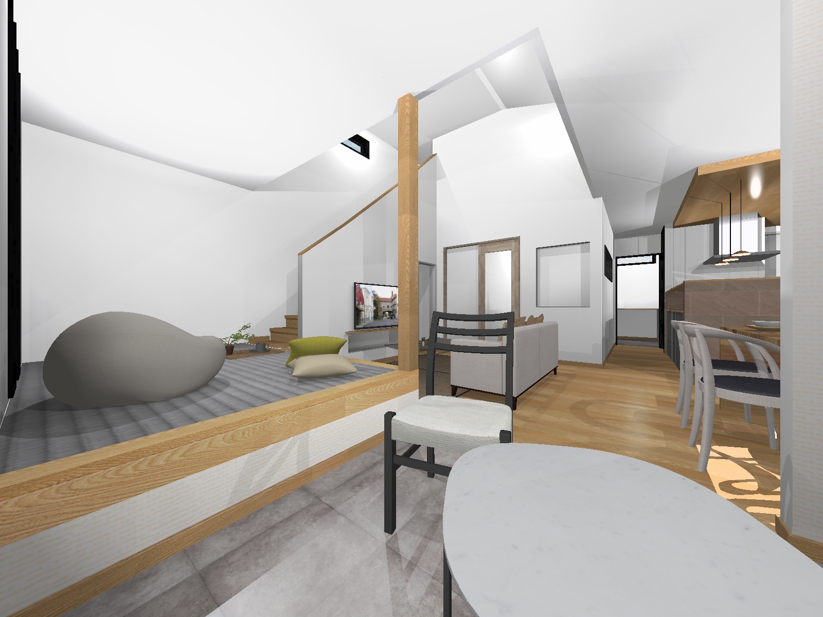 リビング横に設けた畳スペースは、30㎝ほど小上がりにすることで仕切りがなくても空間をゆるく分けることができます。こたつを置いたりお雛様を置くのもいいですね。