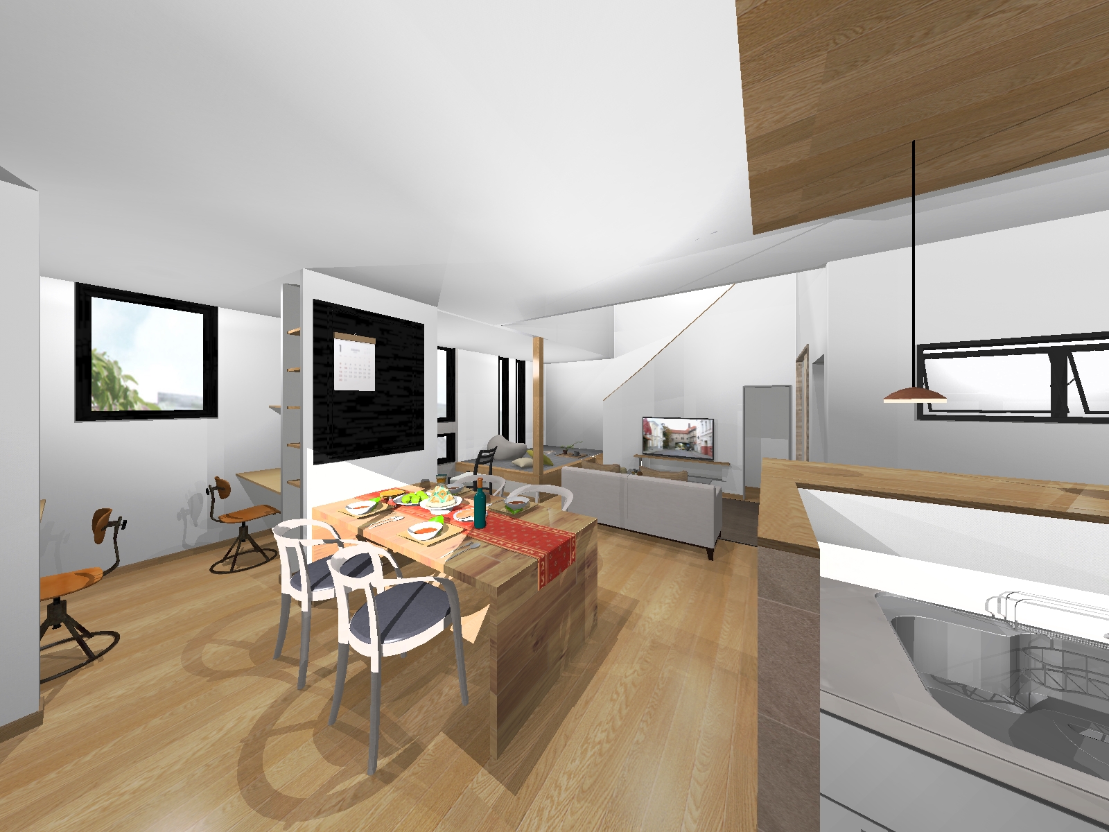 プライバシーの確保ができて日当たりが良い2階リビングの家で、明るくて開放的な空間を実現。さらに、勾配天井と小屋裏スペースを取り入れ使い勝手を向上させました。耐震性もGOOD!