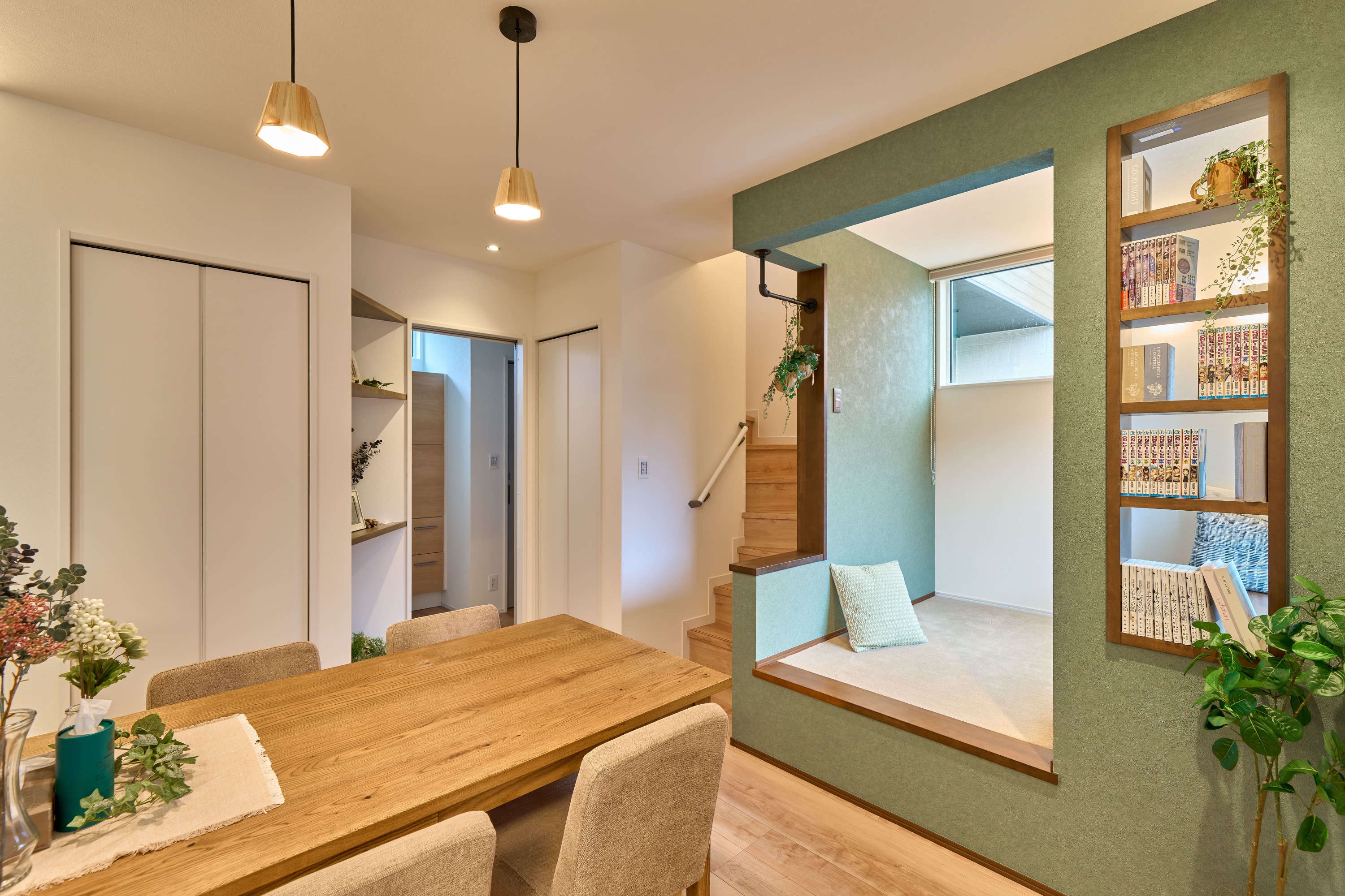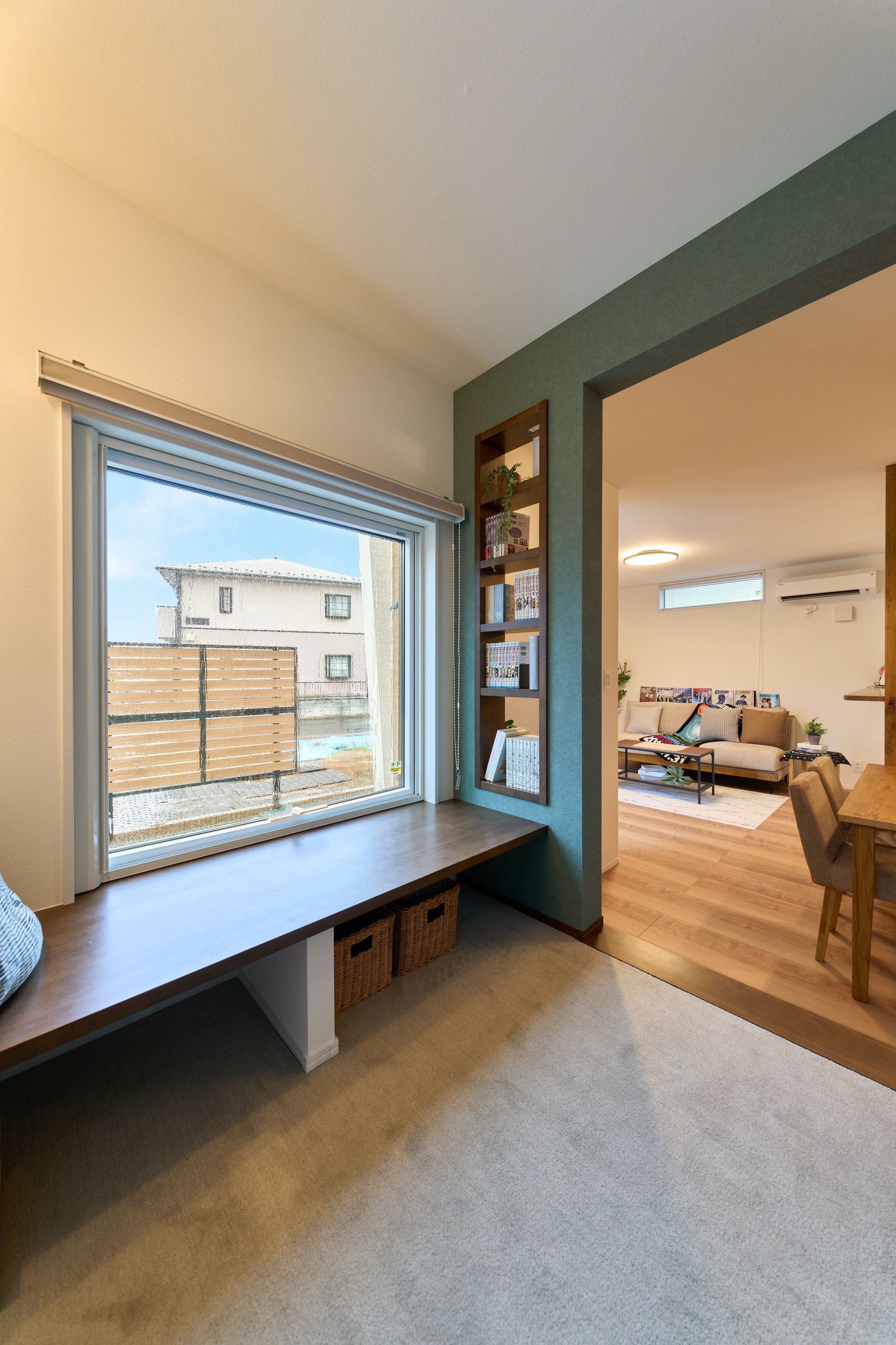 リビングと比べて30cmほど高く上がったスペースは少し腰を掛けたり、おむつ替えスペースとして使用するのにぴったり。カウンターがあるので推し部屋として使ってもいいですね。