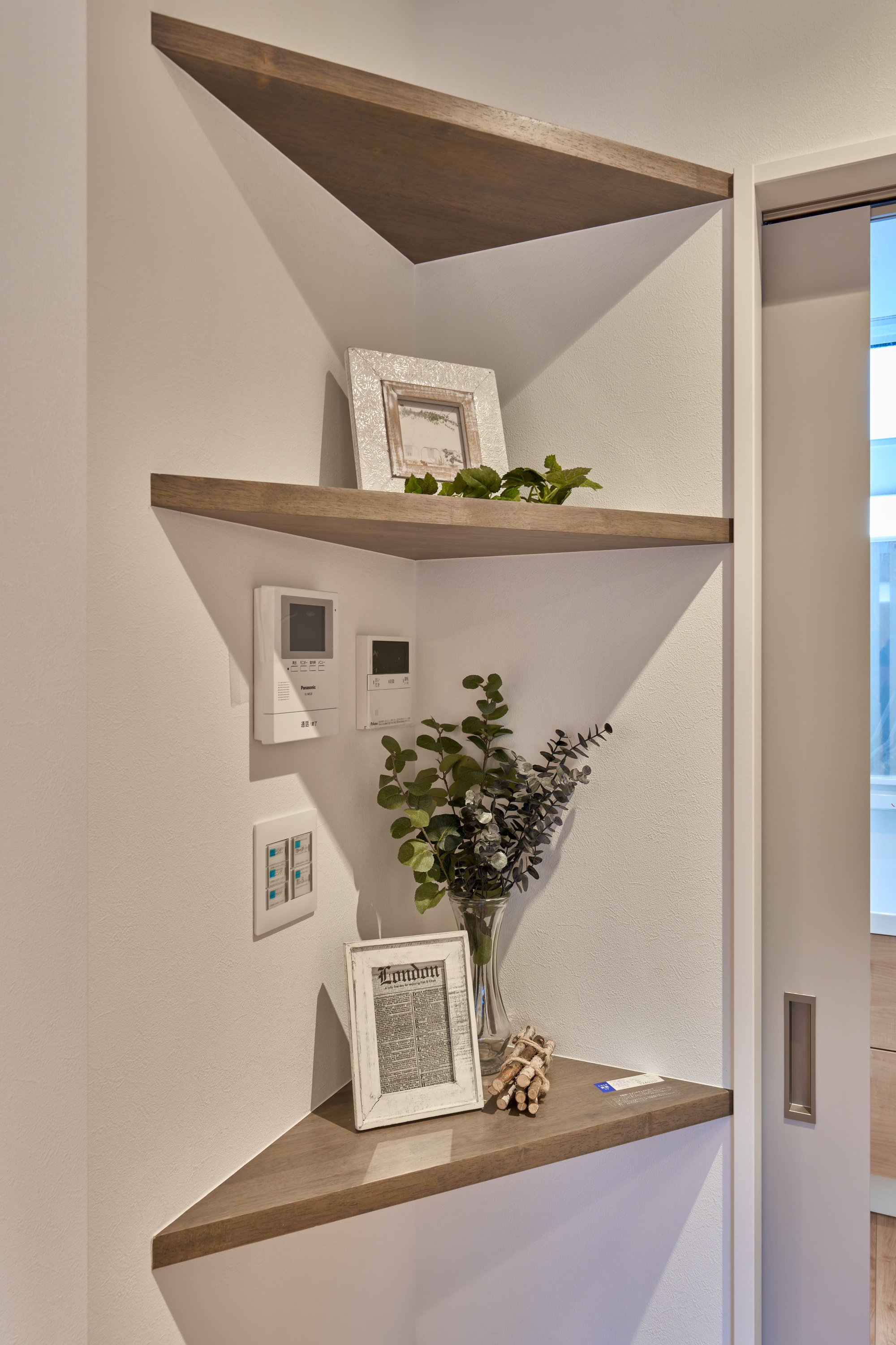 推しをいつでも堪能できるように、家のいろんな場所にニッチやカウンターを用意しました。フィギュアや推し活グッズ、小物などを大切に保管+ディスプレイすることが可能です。