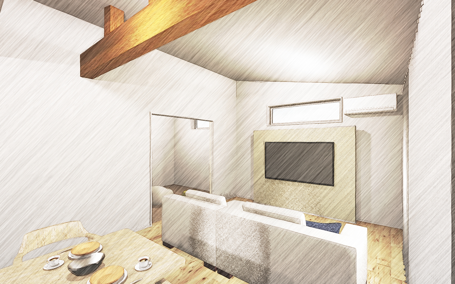 木の温かみを存分に感じられる無垢床や梁など、趣のある空間を仕上げました。造作仕上げの壁掛け TV ボードにも注目です。