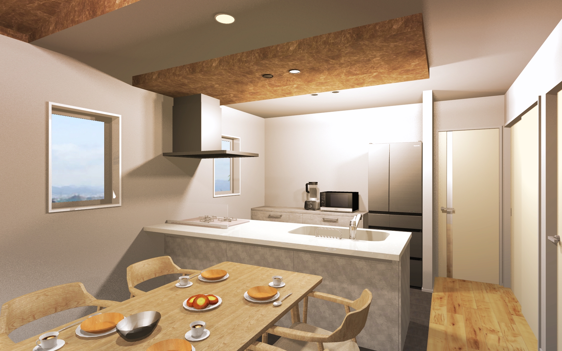 屋根の形に沿って天井を高くした勾配天井で、空間が縦に広がり開放感に溢れたリビング。明るくて気持ちの良い、家族が集まる憩いの場となります。