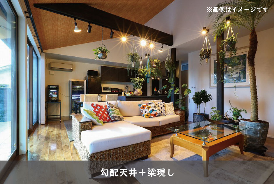 屋根の形に沿って天井を高くした勾配天井で、空間が縦に広がり開放感に溢れたリビング。明るくて気持ちの良い、家族が集まる憩いの場となります。