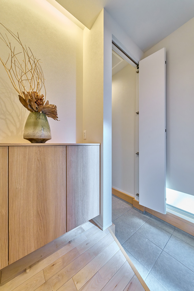扉を開けた先には奥行きがあり人が入れる玄関収納。外の倉庫を用意しなくても自転車やアウトドア用品を収納できます。雨具、上着などを置いておくのもいいですね。