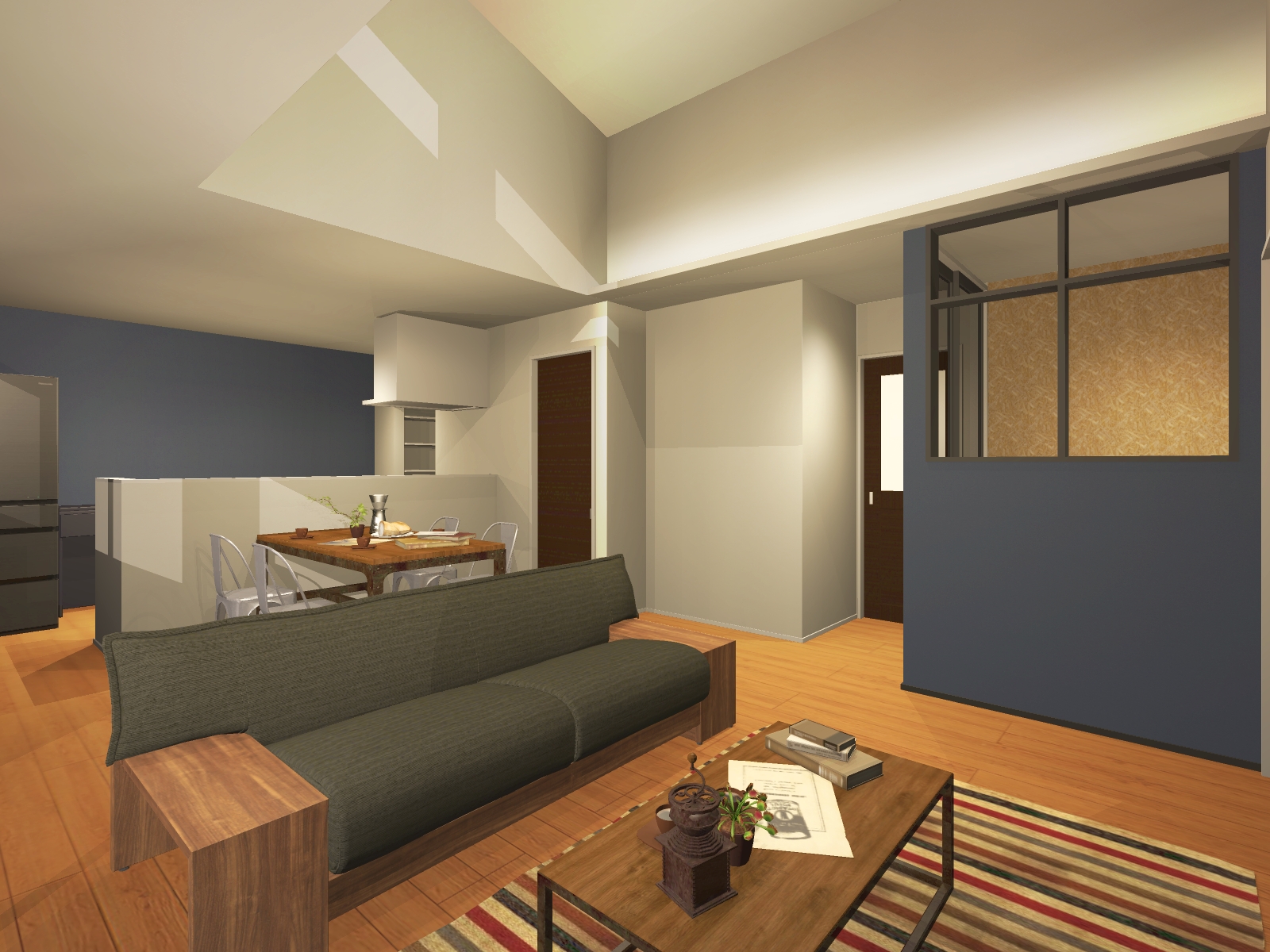 部屋の一角は30㎝ほど1段上がった造り。布団を置けばそのままベッドのように使える寝室です。小上がり部分には間接照明を仕込んでオシャレに仕上げました。