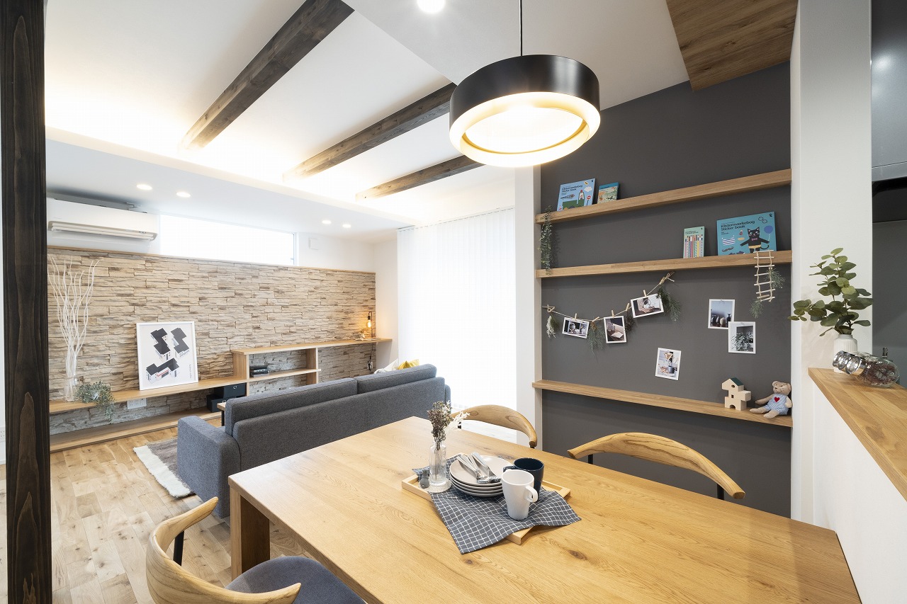 インテリアコーディネーターと考えた、木造ならではの梁を見せたおしゃれなデザイン。照明や床材にもこだわり、ゆったり落ち着いて過ごすことができます。