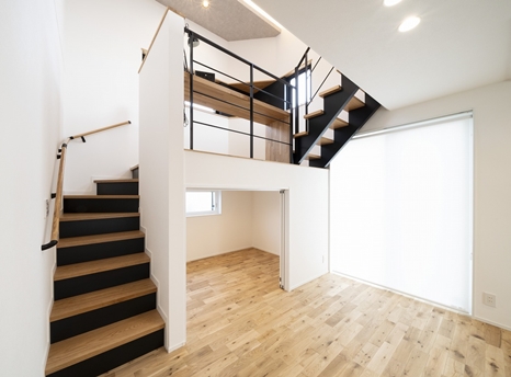 階段の踊り場を利用したスキップフロア。吹き抜けとスキップフロアを組み合わせることにより1階と2階が繋がり、開放感のある空間に仕上がりました。