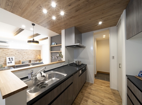 お買い物帰りに玄関からすぐキッチン裏に回れる動線を用意しました。重いものを持って家を回ることがなくなるので、買い置きもたくさんできますね。ゴミ捨てもラクラク!