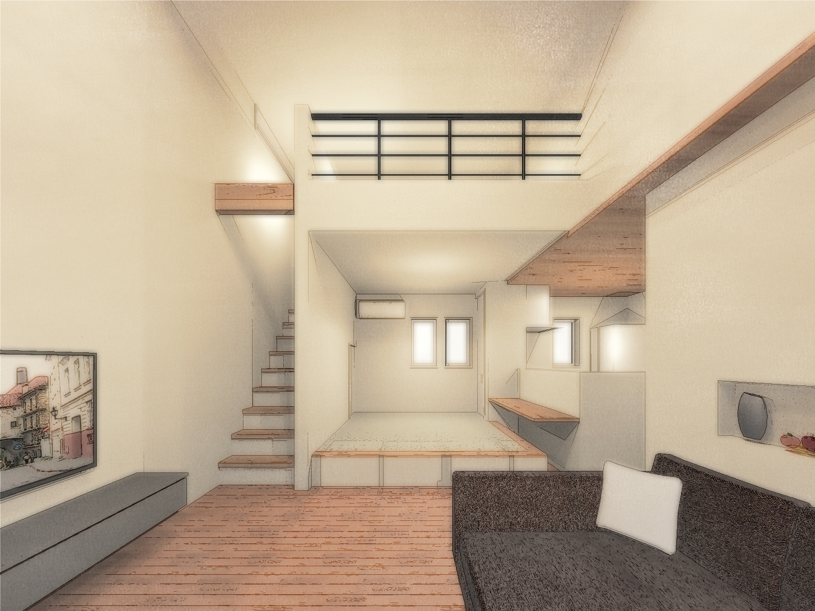 天井の高いスペースを有効活用したスキップフロア。収納スペースとして、書斎として、読書スペースや子どもの遊び場としてなど様々な用途に活用できます。