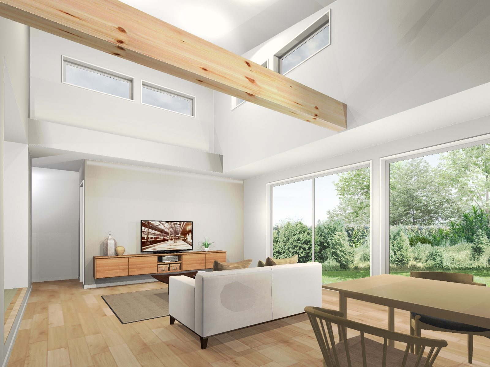 屋根の形に沿って天井を高くした勾配天井で、空間が縦に広がり開放感に溢れたリビング。部屋全体にたっぷりと自然光を取り込め、明るくて気持ちの良い、家族が集まる憩いの場となります。