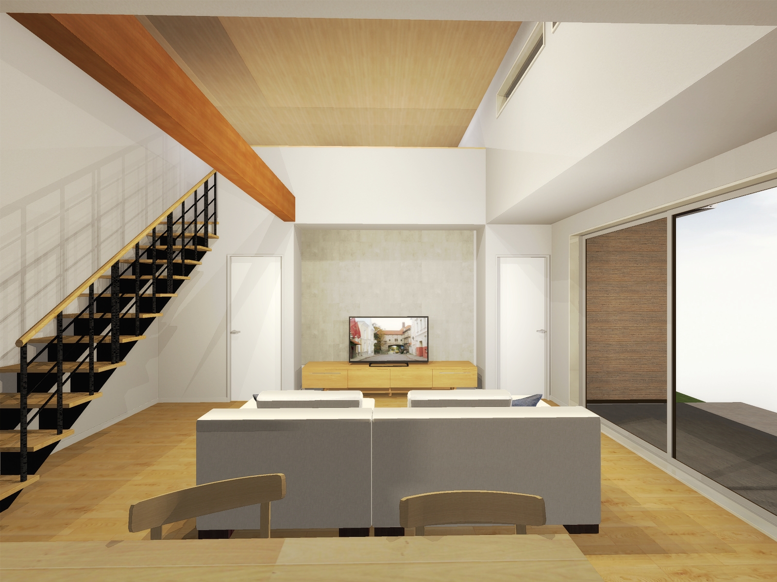 屋根の形に沿って天井を高くした勾配天井で、空間が縦に広がり開放感に溢れたリビング。部屋全体にたっぷりと自然光を取り込め、明るくて気持ちの良い、家族が集まる憩いの場となります。