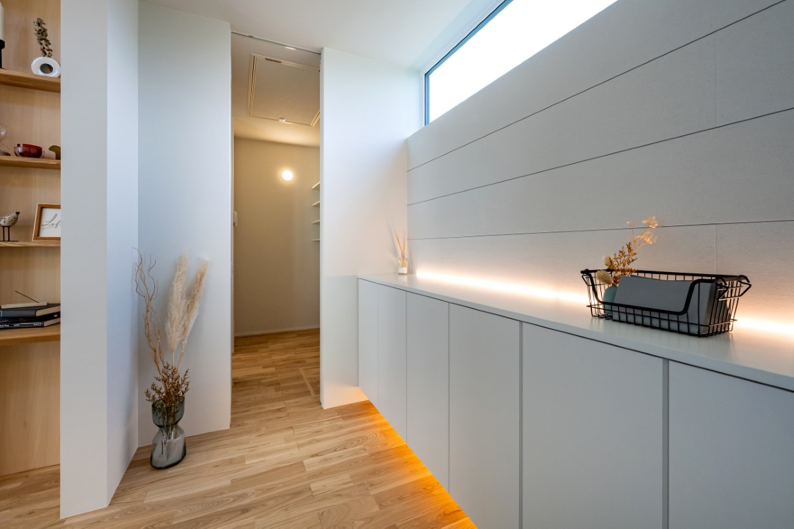日常の動線をスムーズにする工夫が詰まった間取りです。買い物後はパントリーを経由して直接キッチンへ向かう動線や、朝の支度やお風呂時間など、活動時間が被っても使い勝手が良い洗面と脱衣室を分けた間取りなど、使い勝手に優れた間取りをご体感ください。