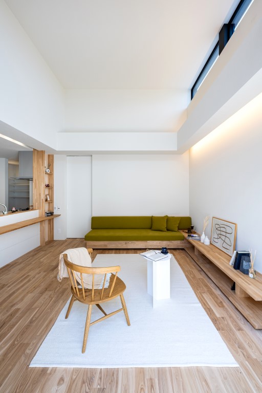 色数を抑え、素材の美しさを引き立てた上質な空間に。自然の温もりと洗練された雰囲気を両立し、間接照明でホテルのような非日常感を演出しました。造作家具やコンセントの位置など、細部にまでこだわった設計です。