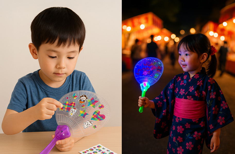 光るうちわにオリジナルシールを切り貼りして、自分だけのデザインに簡単デコレーション!お気に入りのうちわを持ってお祭りや花火大会に出かけよう