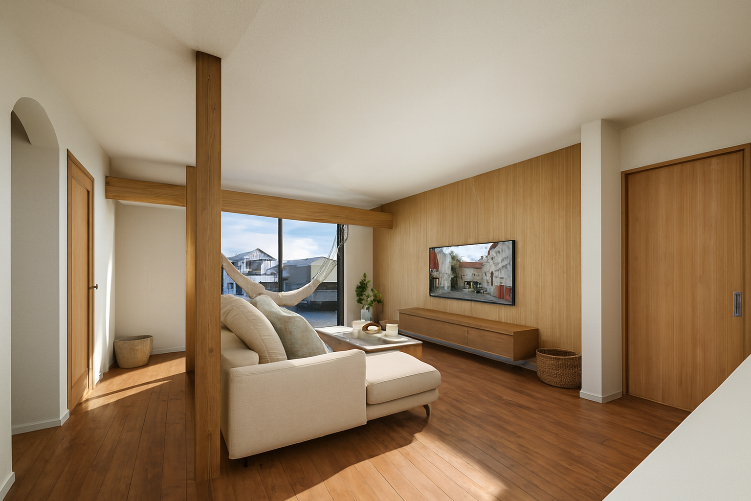 柱をただの構造で終わらせず、けんすい棒やハンモックを設置できる「遊びの仕掛け」に活用。子どもはのびのび遊び、大人は運動やリフレッシュに使える、家族みんなが自然と集まるリビングです。