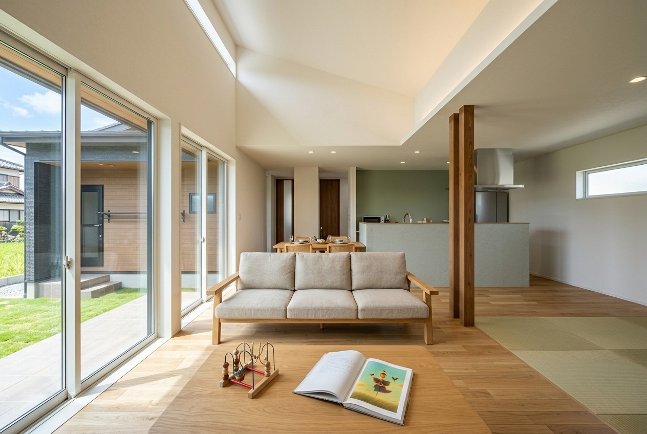 屋根の形に沿って天井を高くした勾配天井で、空間が縦に広がり開放感に溢れたリビング。明るくて気持ちの良い、家族が集まる憩いの場となります。