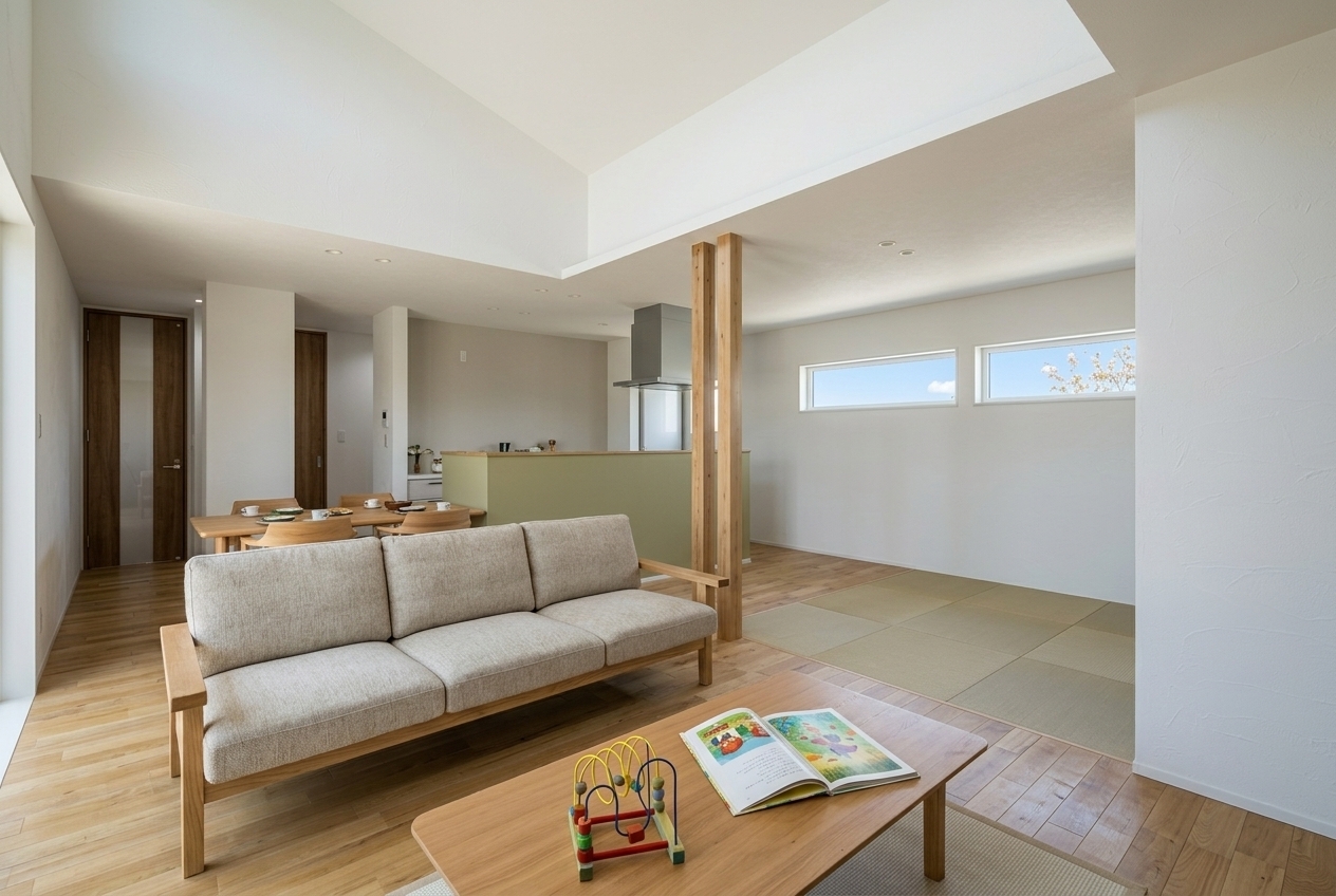 リビングの一角に設けた3.7帖の畳スペース。板の間もあり季節物を飾れる仕様に。お子さまの遊び場や来客用スペース、お昼寝にも最適です。