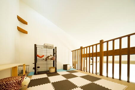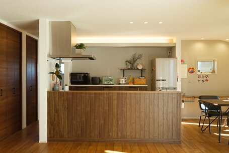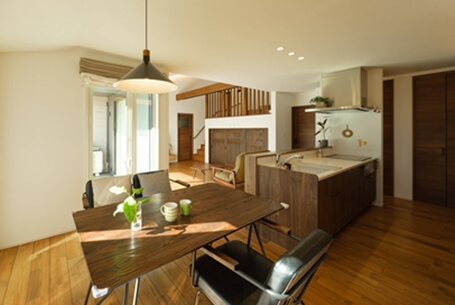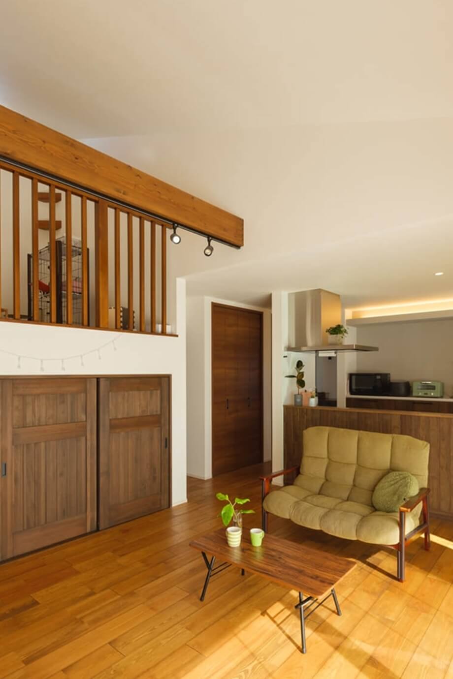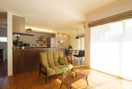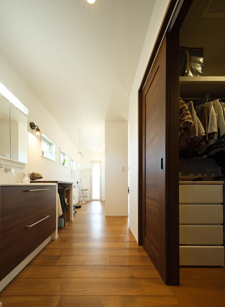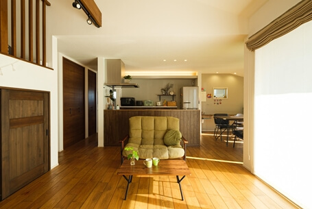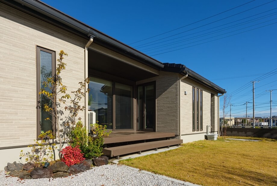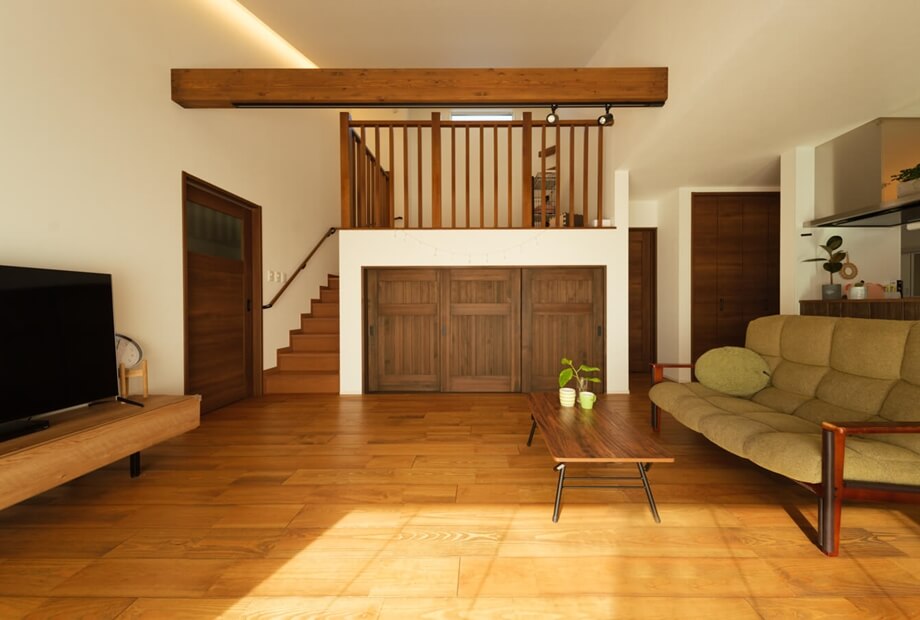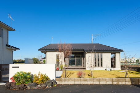 LDKにたくさん光が差し込むように南側の外周をコの字型にした平屋は、勾配天井のリビングに大胆なスキップフロアを設け、落ち着きと明るさを両立したテイスト。スキップフロアの上部はタタミでくつろげる憩いのスペース、下部は大容量の収納として使用することができます。家の様々な箇所に採用した回遊動線(寝室、収納、キッチン、水回り)や外干し・室内干しにも便利なランドリールーム、壁で2動線に分けた玄関にも注目です。