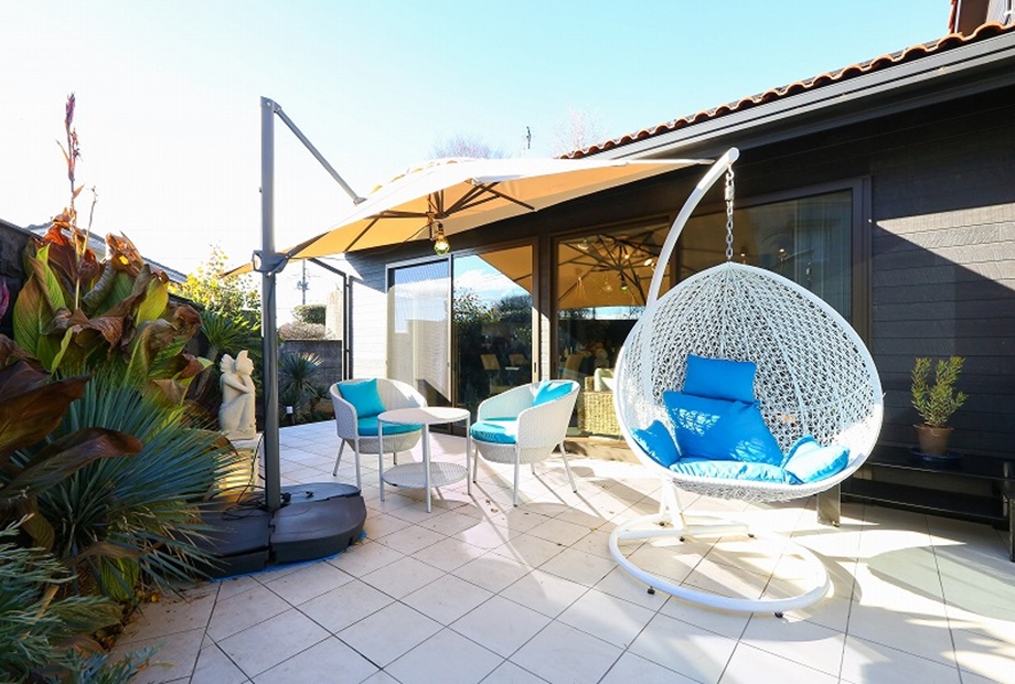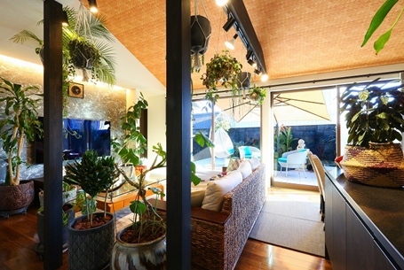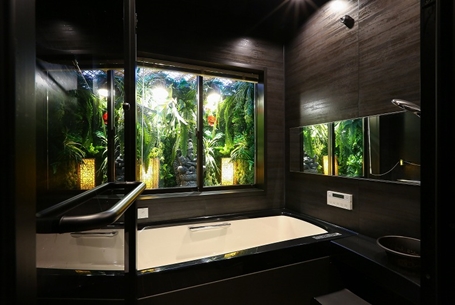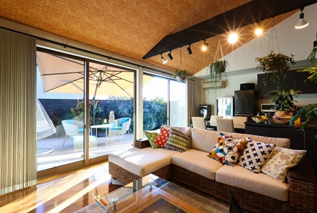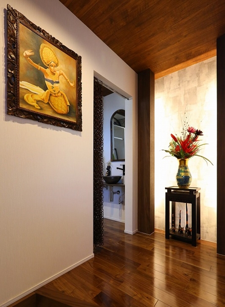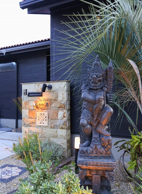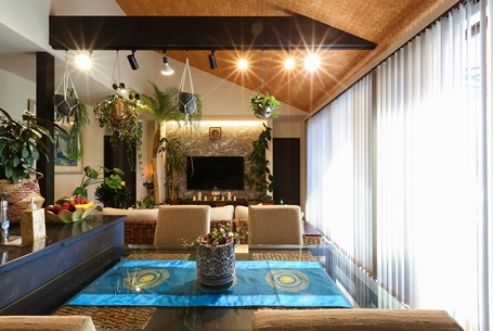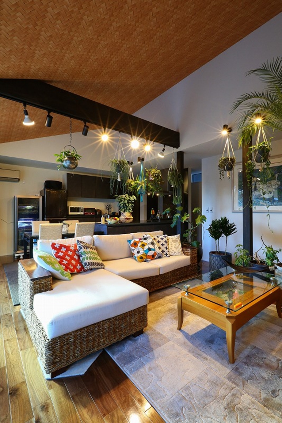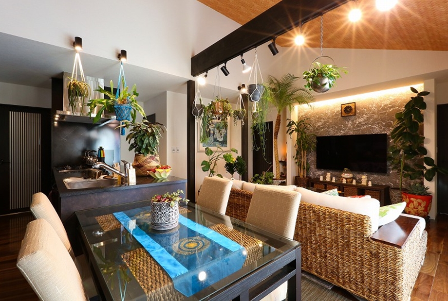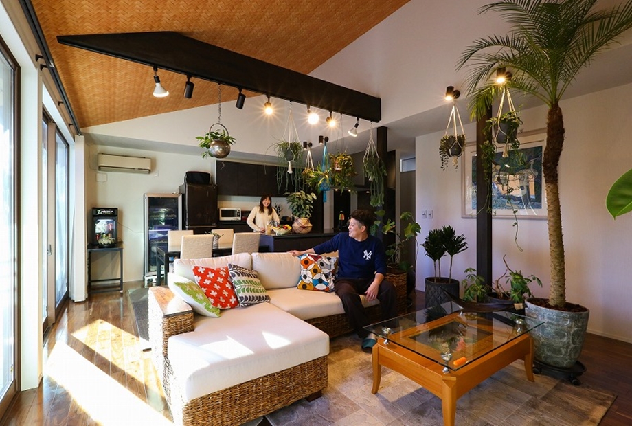 将来を見据えた暮らしやすさを追求し、回遊動線を取り入れた南国バリを彷彿とさせるリゾートスタイルの平屋。大きな窓や勾配天井のあるLDKと外のタイルデッキを繋げることで、外と中に繋がりを持たせた開放感抜群の生活が楽しめます。回遊動線やウォークスルークローゼットで暮らしやすさを追求しつつ、ご主人の趣味のアクアリウム部屋や奥様専用の書斎など、暮らしを楽しむ工夫も盛りだくさん。晴れの日はテラスで朝食を楽しんだり、BBQをしたりと、毎日旅行気分を楽しめるようなワクワクするお家です。
