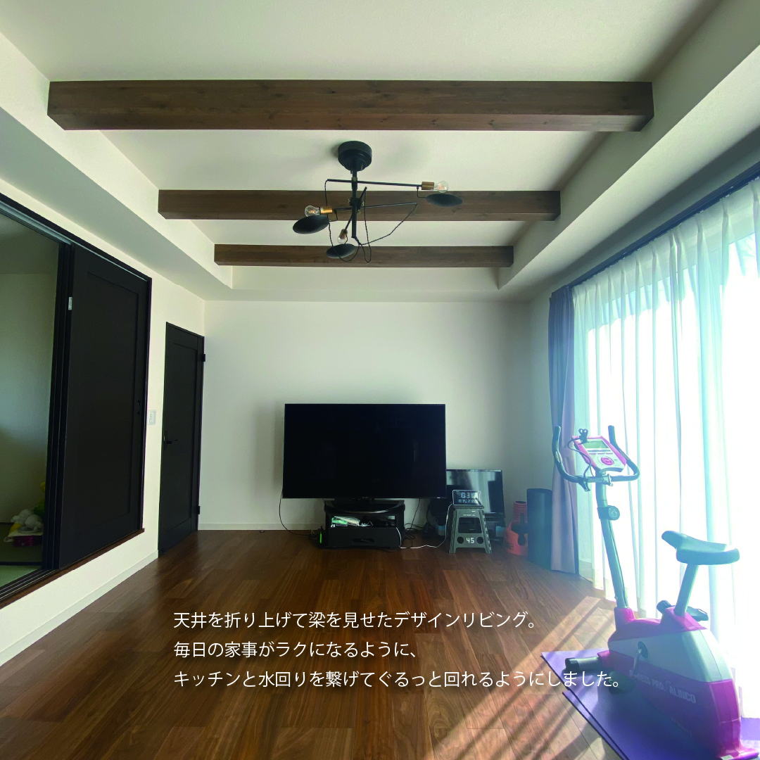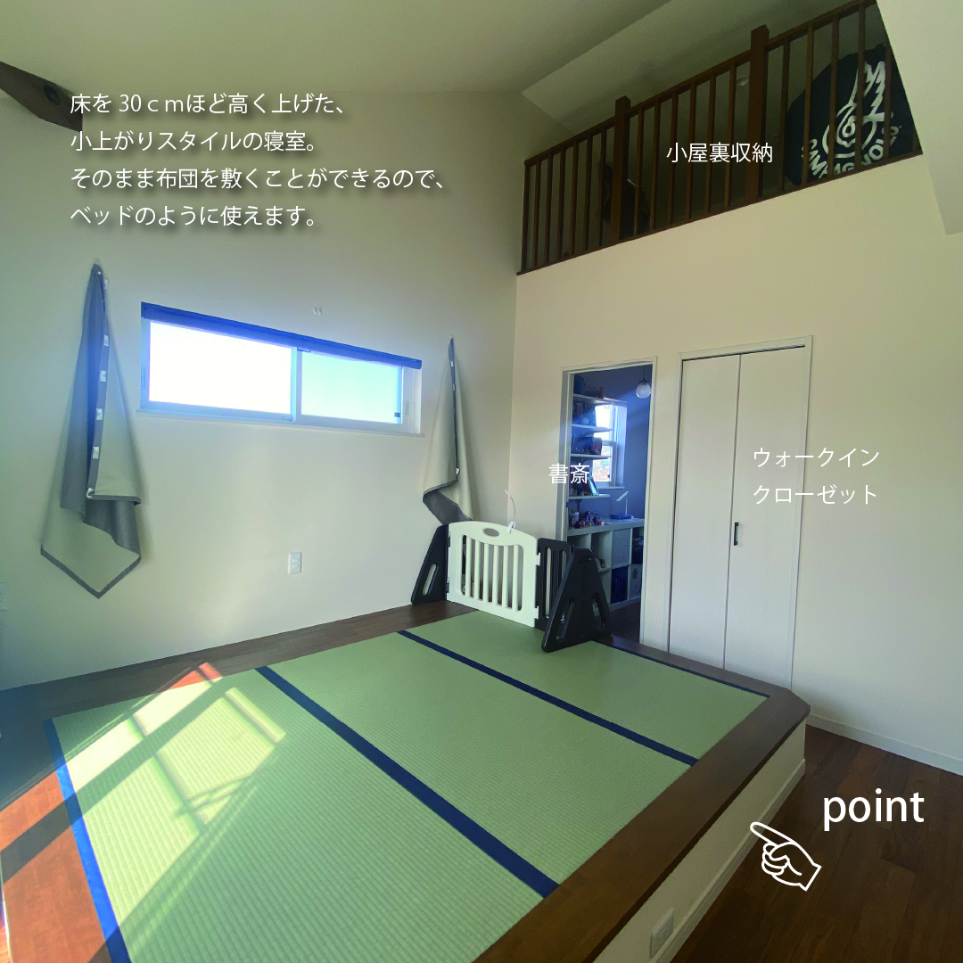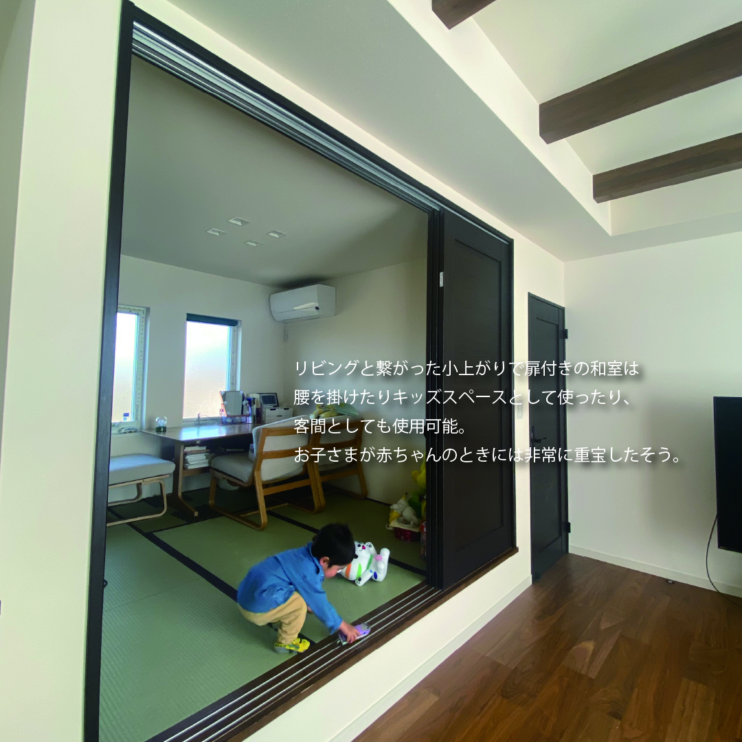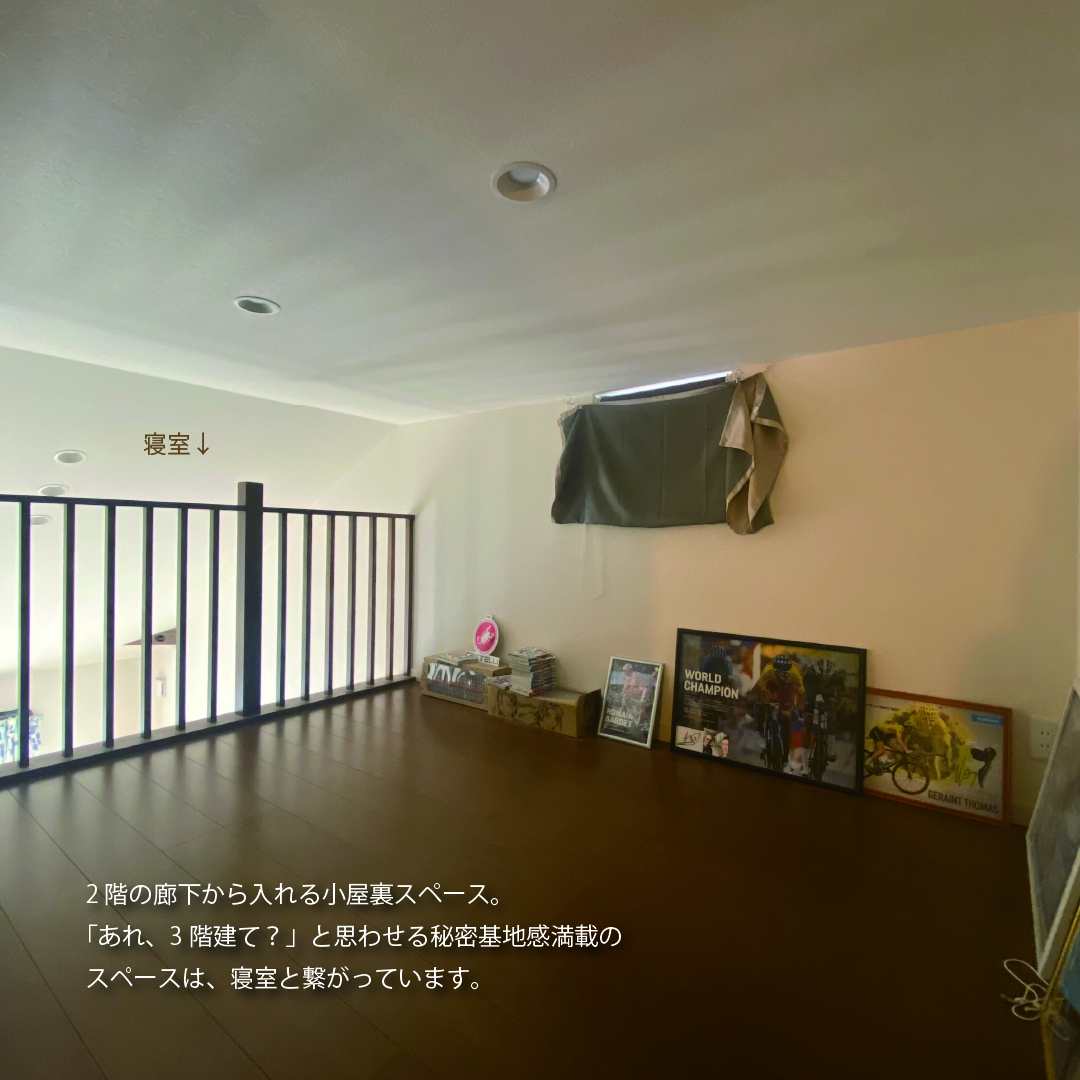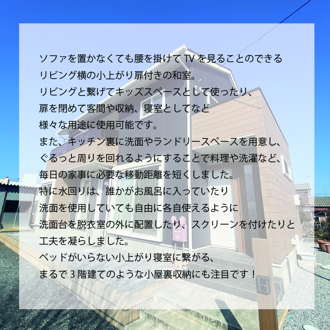 まるで3階建てのような家。ソファを置かなくても腰を掛けてTVを見ることのできるリビング横の小上がり扉付きの和室。リビングと繋げてキッズスペースとして使ったり、扉を閉めて客間や収納、寝室としてなど様々な用途に使用可能です。また、キッチン裏に洗面やランドリースペースを用意し、ぐるっと周りを回れるようにすることで料理や洗濯など毎日の家事に必要な移動距離を短くしました。特に水回りは、誰かがお風呂に入っていたり、洗面を使用していても自由に使えるように、脱衣室の外に洗面台を配置したり、スクリーンを付けたりと工夫を凝らしました。ベッドがいらない小上がり寝室に繋がるまるで3階建てのような小屋裏収納にも注目です!