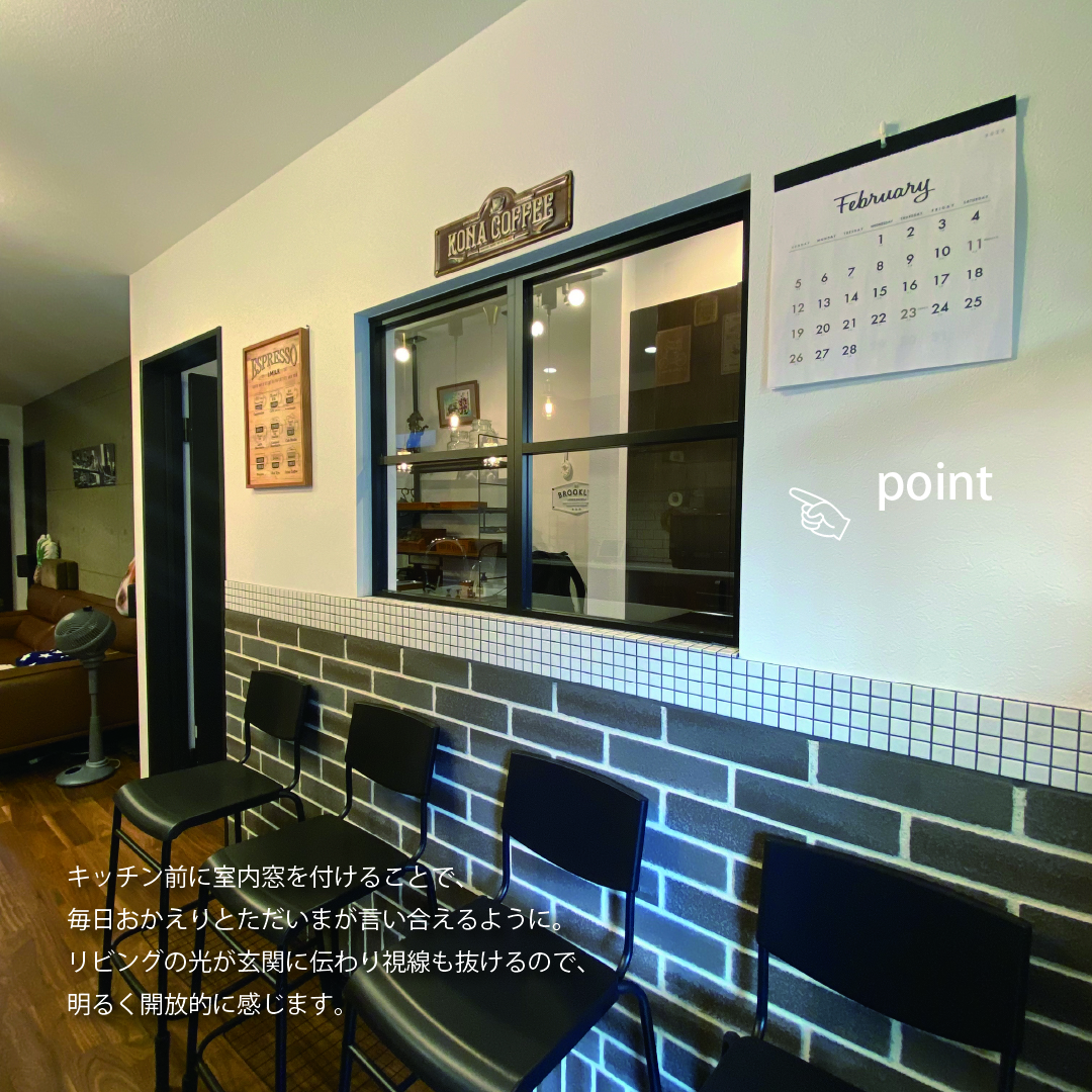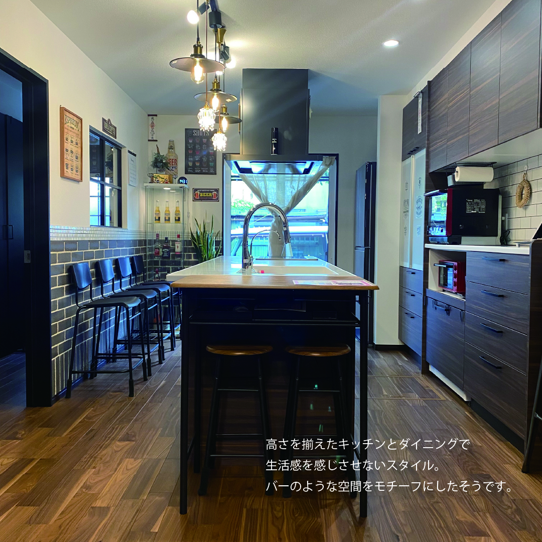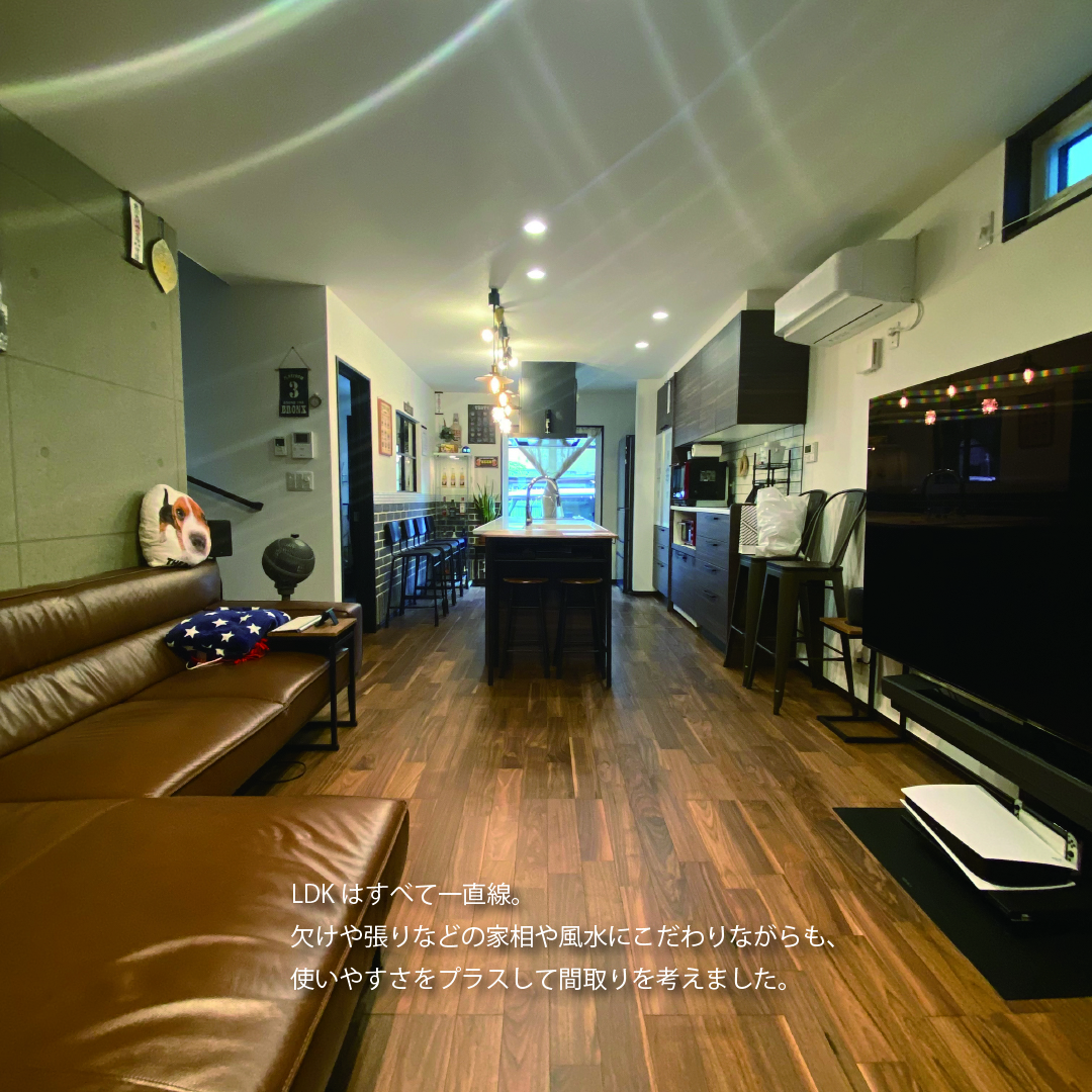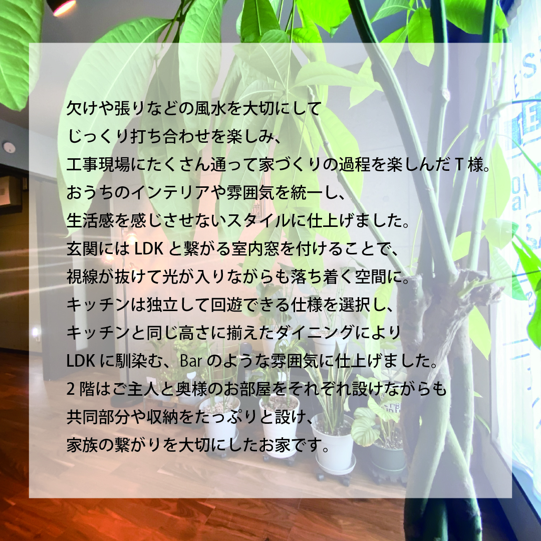 欠けや張りなどの風水を大切にしてじっくり打ち合わせを楽しみ、工事現場にたくさん通って家づくりの過程を楽しんだT様。玄関にはLDKと繋がる室内窓を付けることで、視線が抜けながらも落ち着くように。キッチンは独立して回遊できる仕様を選択し、キッチンと同じ高さに揃えたダイニングによりLDKに馴染む、Barのような雰囲気に仕上げました。2階はご主人と奥様のお部屋をそれぞれ設けながらも共同部分や収納をたっぷりと設けた、家族の繋がりを大切にしたお家です。