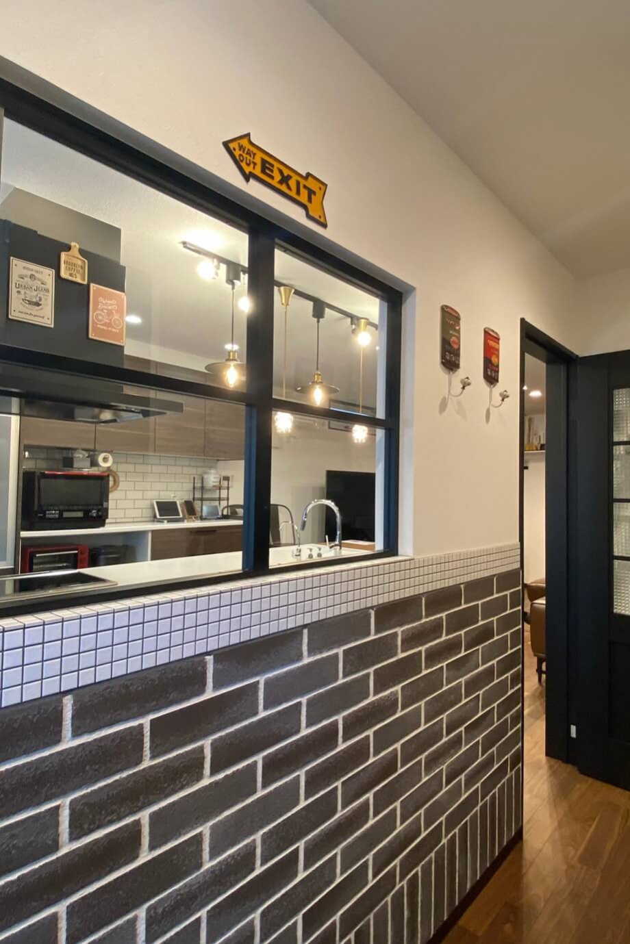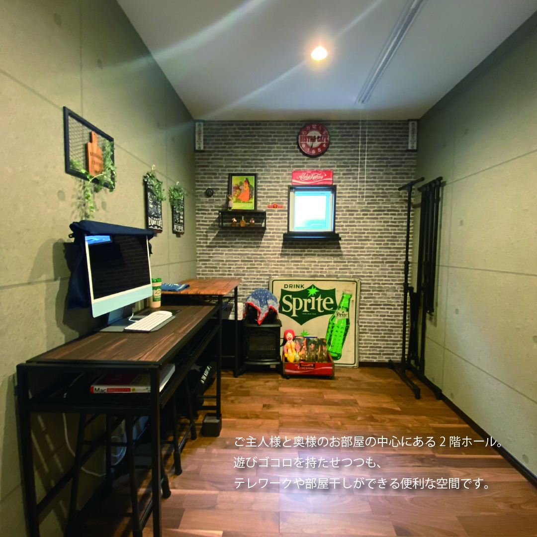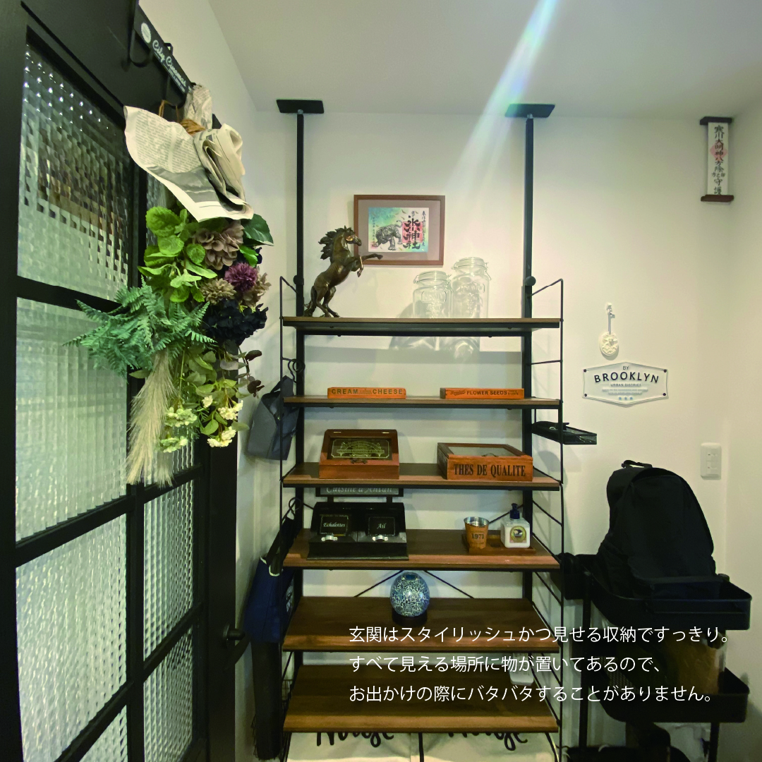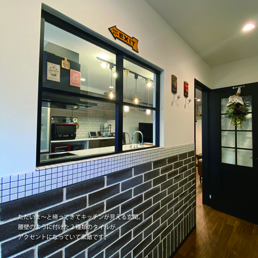 欠けや張りなどの風水を大切にしてじっくり打ち合わせを楽しみ、工事現場にたくさん通って家づくりの過程を楽しんだT様。玄関にはLDKと繋がる室内窓を付けることで、視線が抜けながらも落ち着くように。キッチンは独立して回遊できる仕様を選択し、キッチンと同じ高さに揃えたダイニングによりLDKに馴染む、Barのような雰囲気に仕上げました。2階はご主人と奥様のお部屋をそれぞれ設けながらも共同部分や収納をたっぷりと設けた、家族の繋がりを大切にしたお家です。