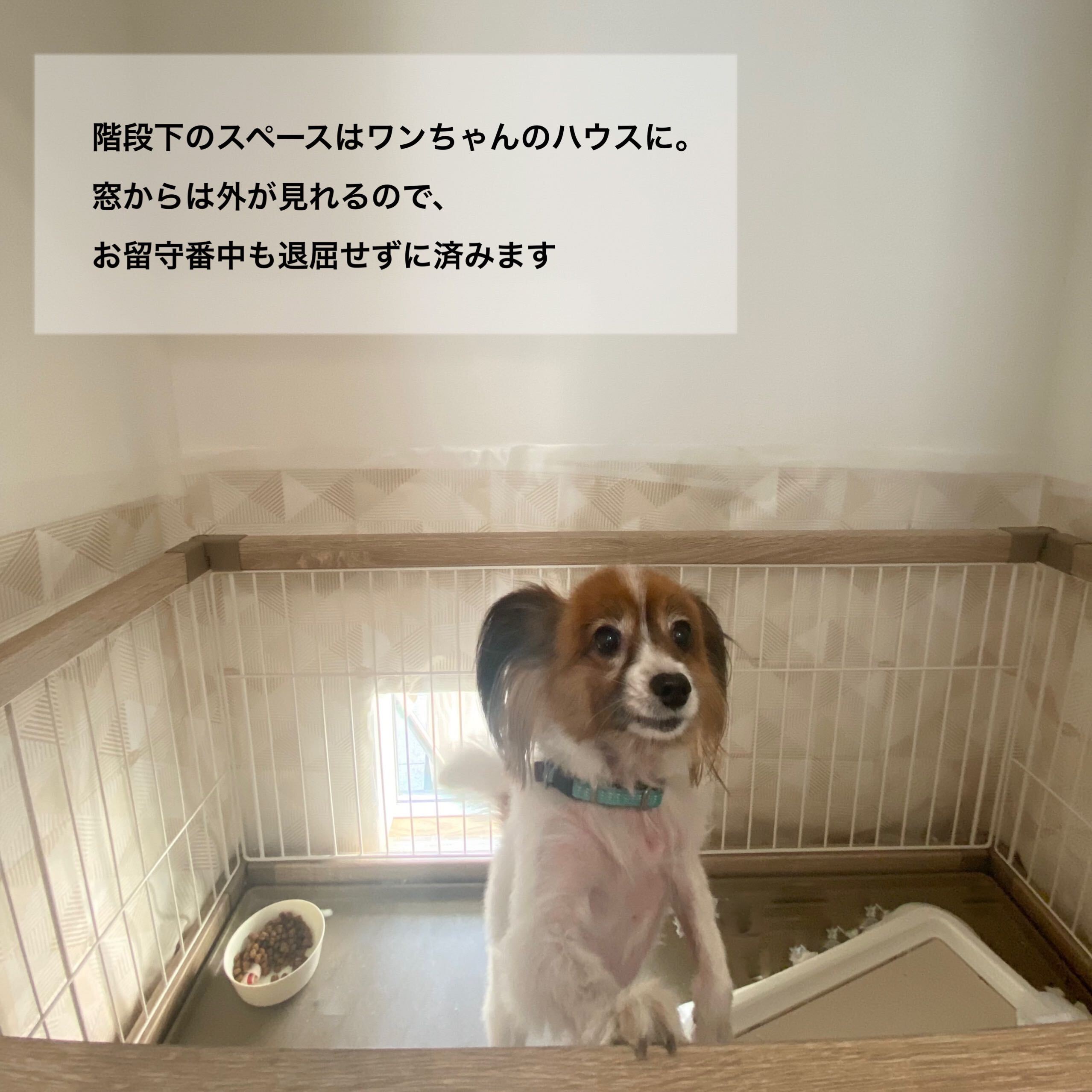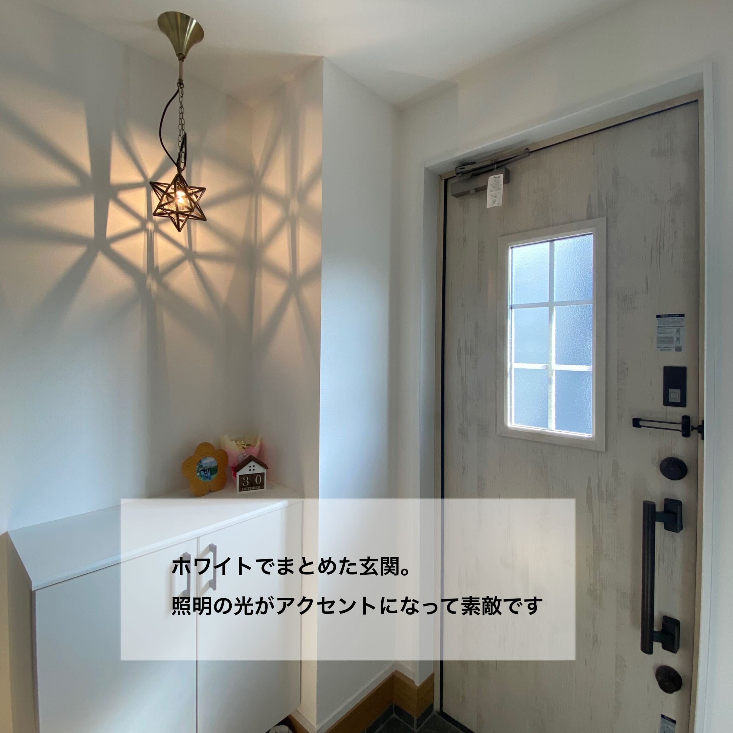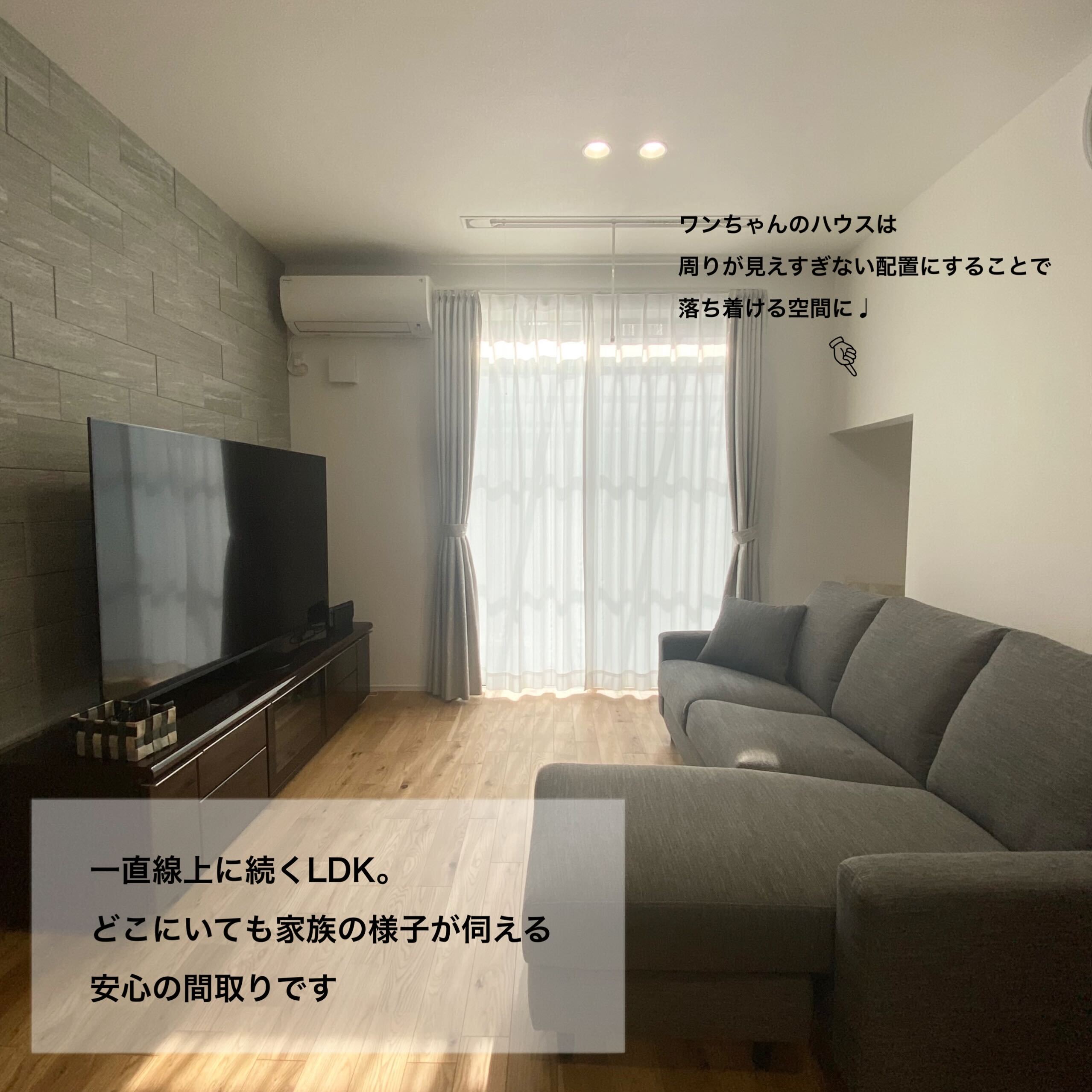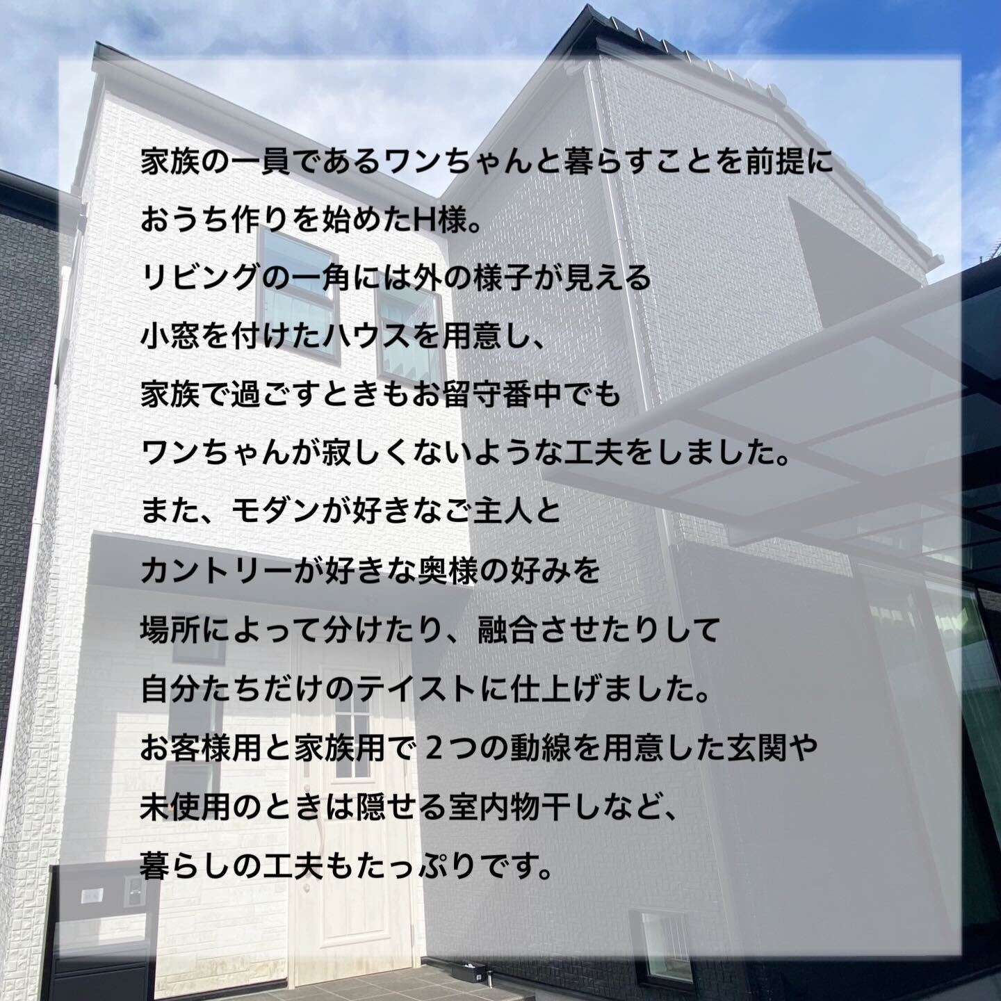 家族の一員であるワンちゃんと暮らすことを前提におうち作りを始めたH様。 リビングの一角には外の様子が見える小窓を付けたハウスを用意し、家族で過ごすときもお留守番中でもワンちゃんが寂しくないような工夫をしました。また、モダンデザインが好きなご主人とカントリーデザインが好きな奥様の好みを場所によって分けたり、融合させたりして自分たちだけのテイストに仕上げました。お客様用と家族用で2つの動線を用意した玄関や未使用のときは隠せる室内物干しなど、暮らしの工夫もたっぷりです。