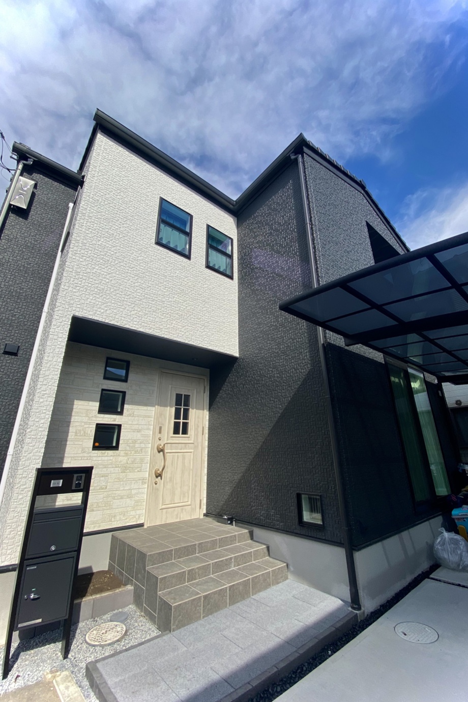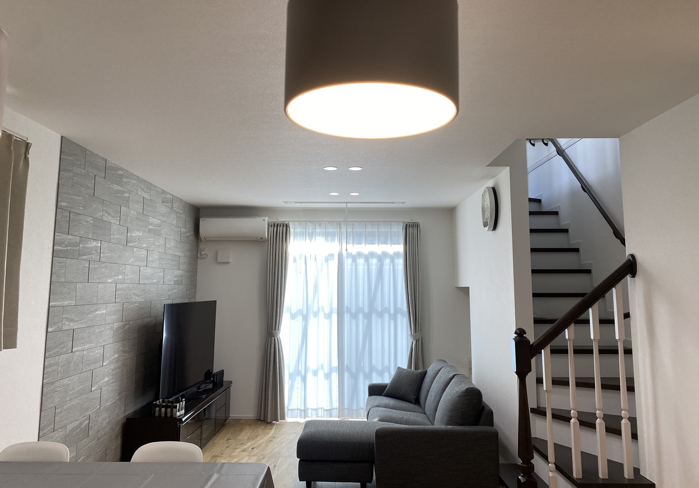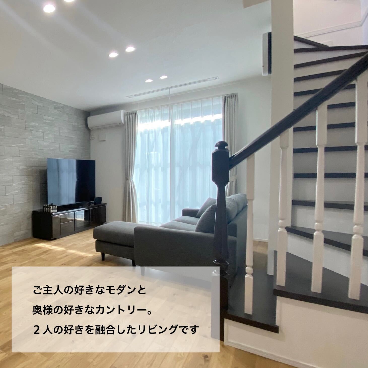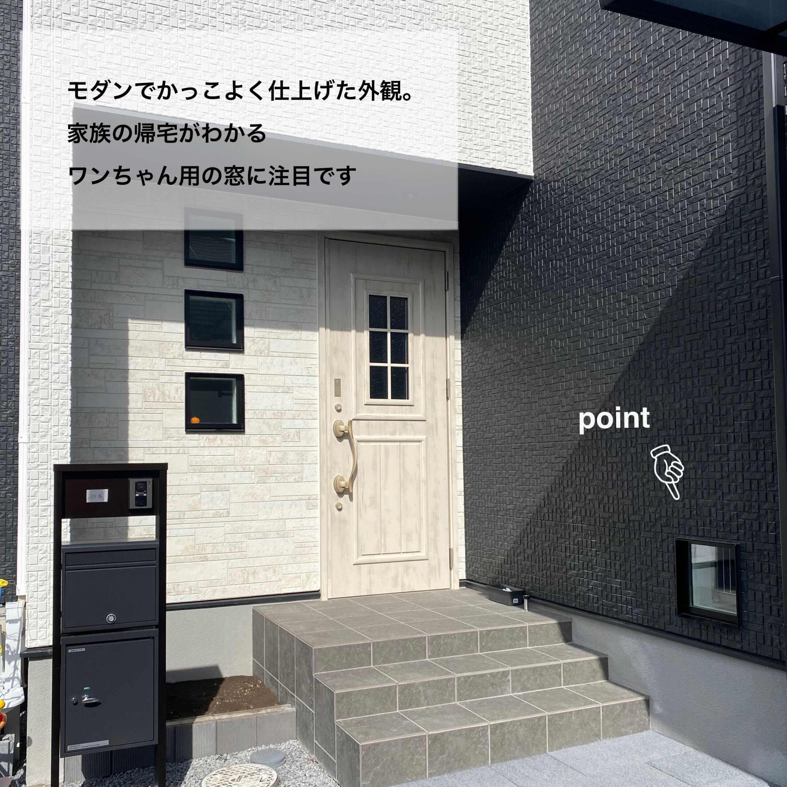 家族の一員であるワンちゃんと暮らすことを前提におうち作りを始めたH様。 リビングの一角には外の様子が見える小窓を付けたハウスを用意し、家族で過ごすときもお留守番中でもワンちゃんが寂しくないような工夫をしました。また、モダンデザインが好きなご主人とカントリーデザインが好きな奥様の好みを場所によって分けたり、融合させたりして自分たちだけのテイストに仕上げました。お客様用と家族用で2つの動線を用意した玄関や未使用のときは隠せる室内物干しなど、暮らしの工夫もたっぷりです。