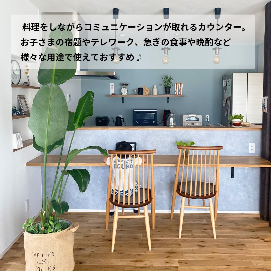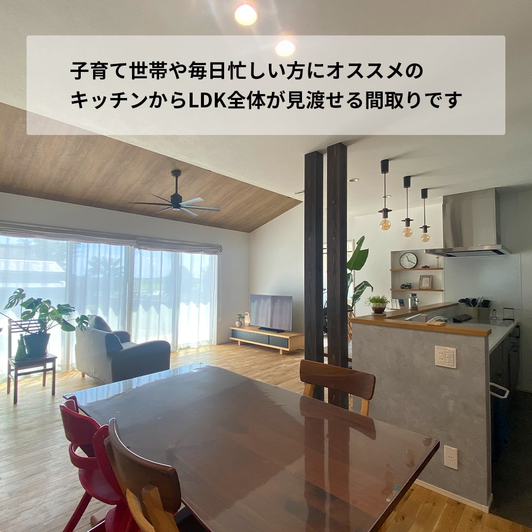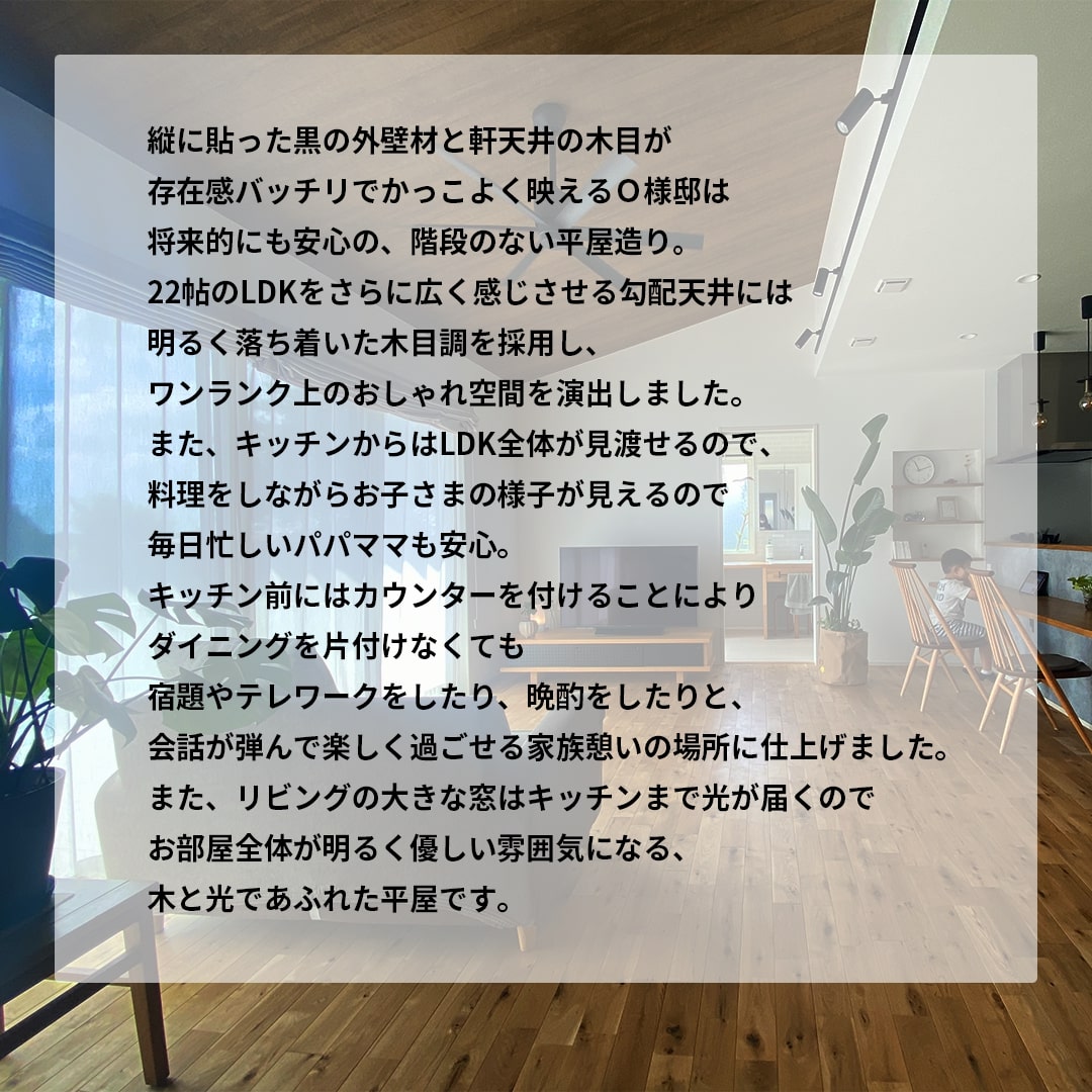 22帖のLDKをさらに広く感じさせる勾配天井には 明るく落ち着いた木目調を採用しワンランク上のおしゃれ空間を演出しました。 またキッチンからはLDK全体が見渡せ、料理をしながらお子さまの様子が見れるので 毎日忙しいパパママも安心です。キッチン前にはカウンターを付けることによりダイニングを片付けなくても宿題やテレワークをしたり、晩酌をしたりと、会話が弾んで楽しく過ごせる家族憩いの場所に仕上げました。リビングの大きな窓からキッチンまで光が届き、お部屋全体が明るく優しい雰囲気の木と光であふれた平屋です。