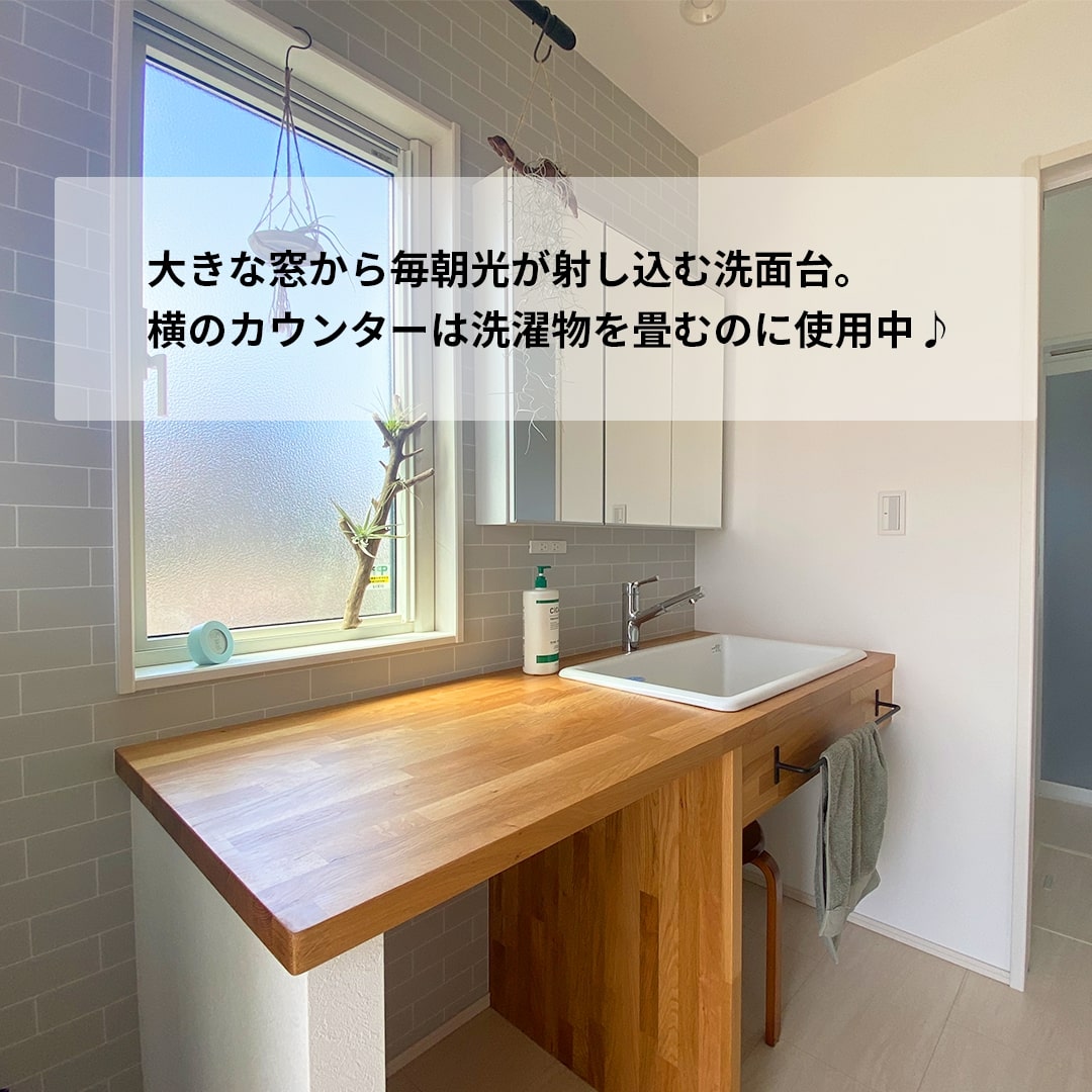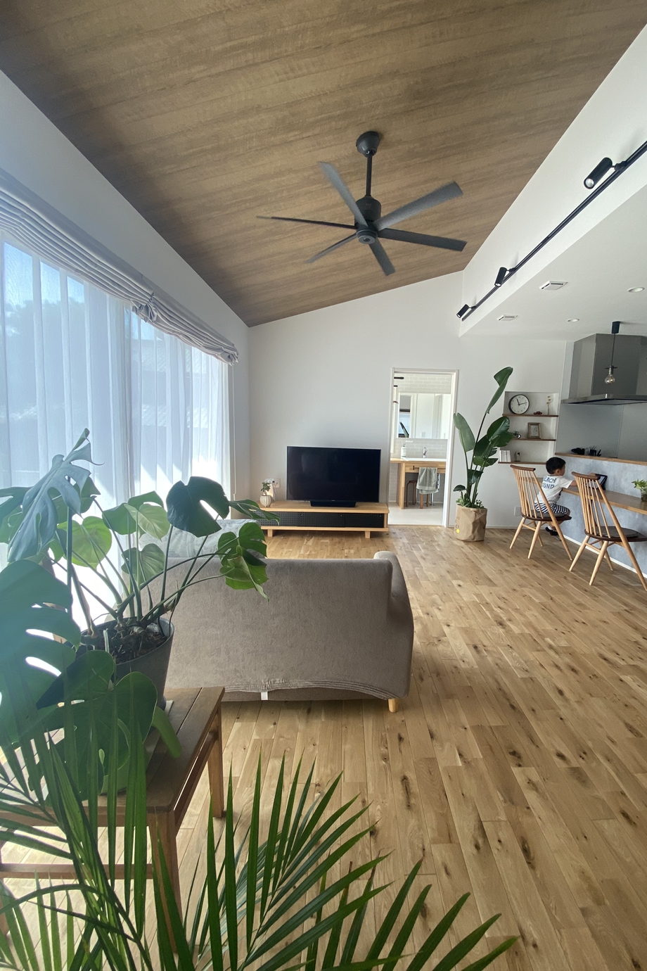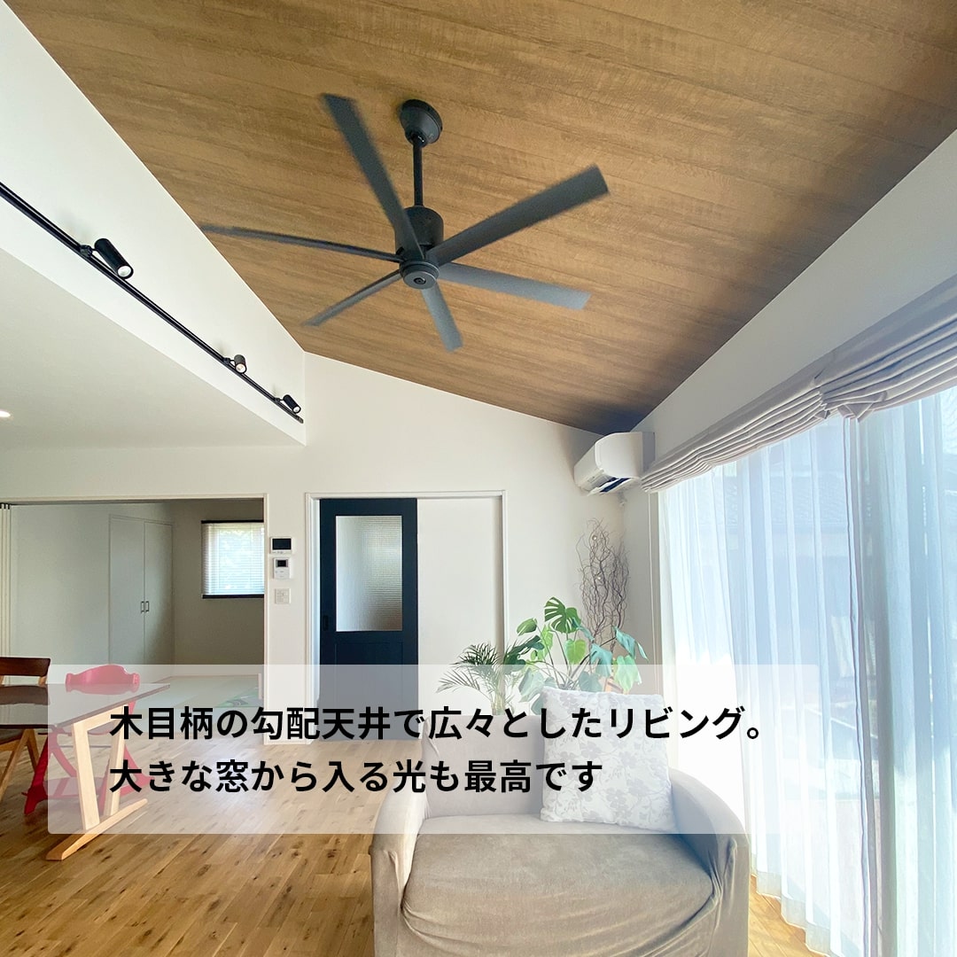 22帖のLDKをさらに広く感じさせる勾配天井には 明るく落ち着いた木目調を採用しワンランク上のおしゃれ空間を演出しました。 またキッチンからはLDK全体が見渡せ、料理をしながらお子さまの様子が見れるので 毎日忙しいパパママも安心です。キッチン前にはカウンターを付けることによりダイニングを片付けなくても宿題やテレワークをしたり、晩酌をしたりと、会話が弾んで楽しく過ごせる家族憩いの場所に仕上げました。リビングの大きな窓からキッチンまで光が届き、お部屋全体が明るく優しい雰囲気の木と光であふれた平屋です。