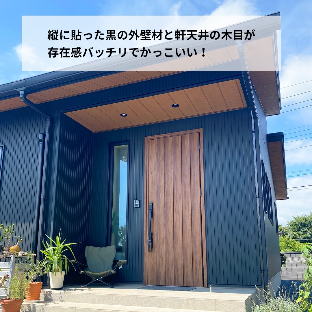 縦に貼った黒の外壁材と軒天井の木目が存在感バッチリでかっこよく映えるO様邸。